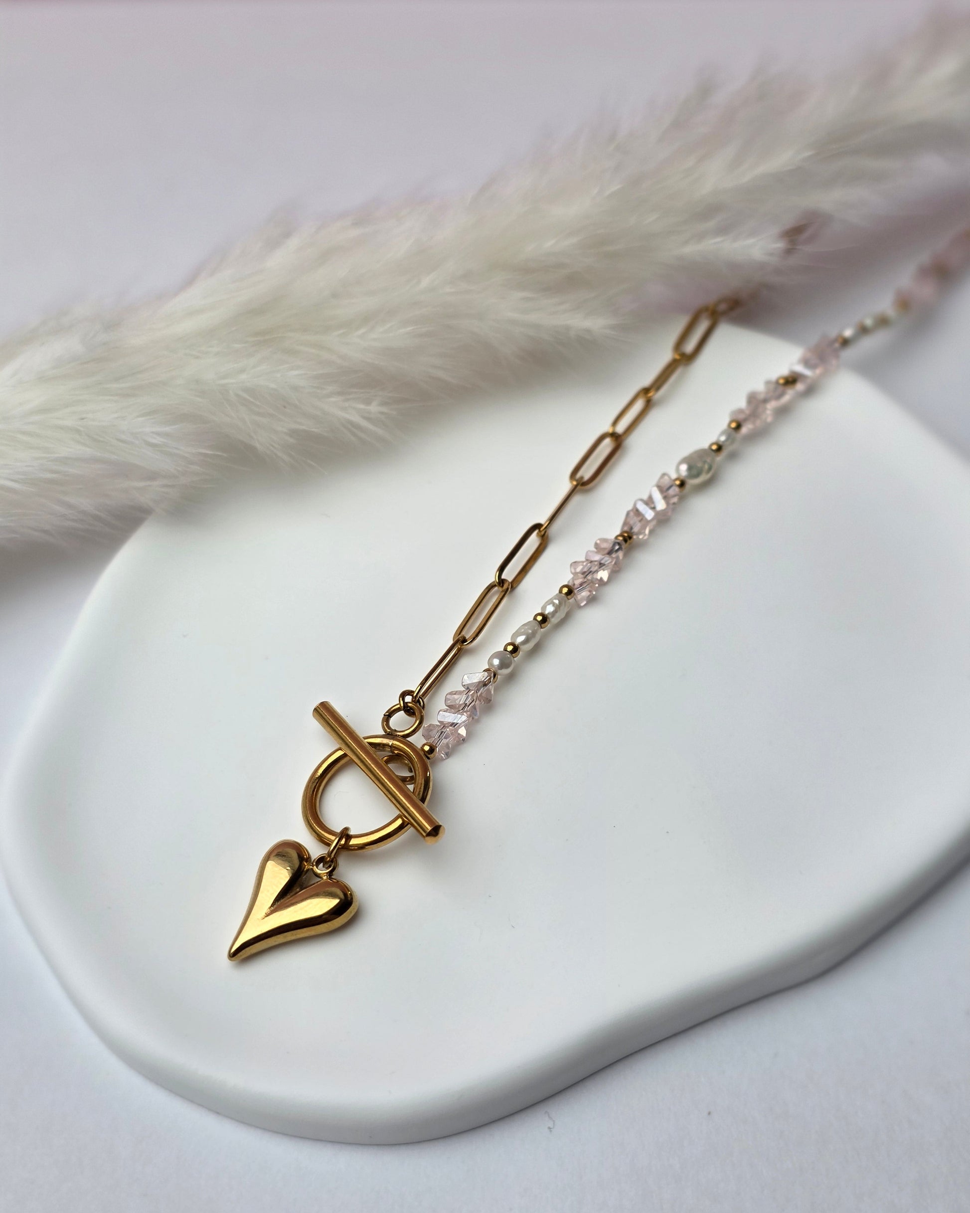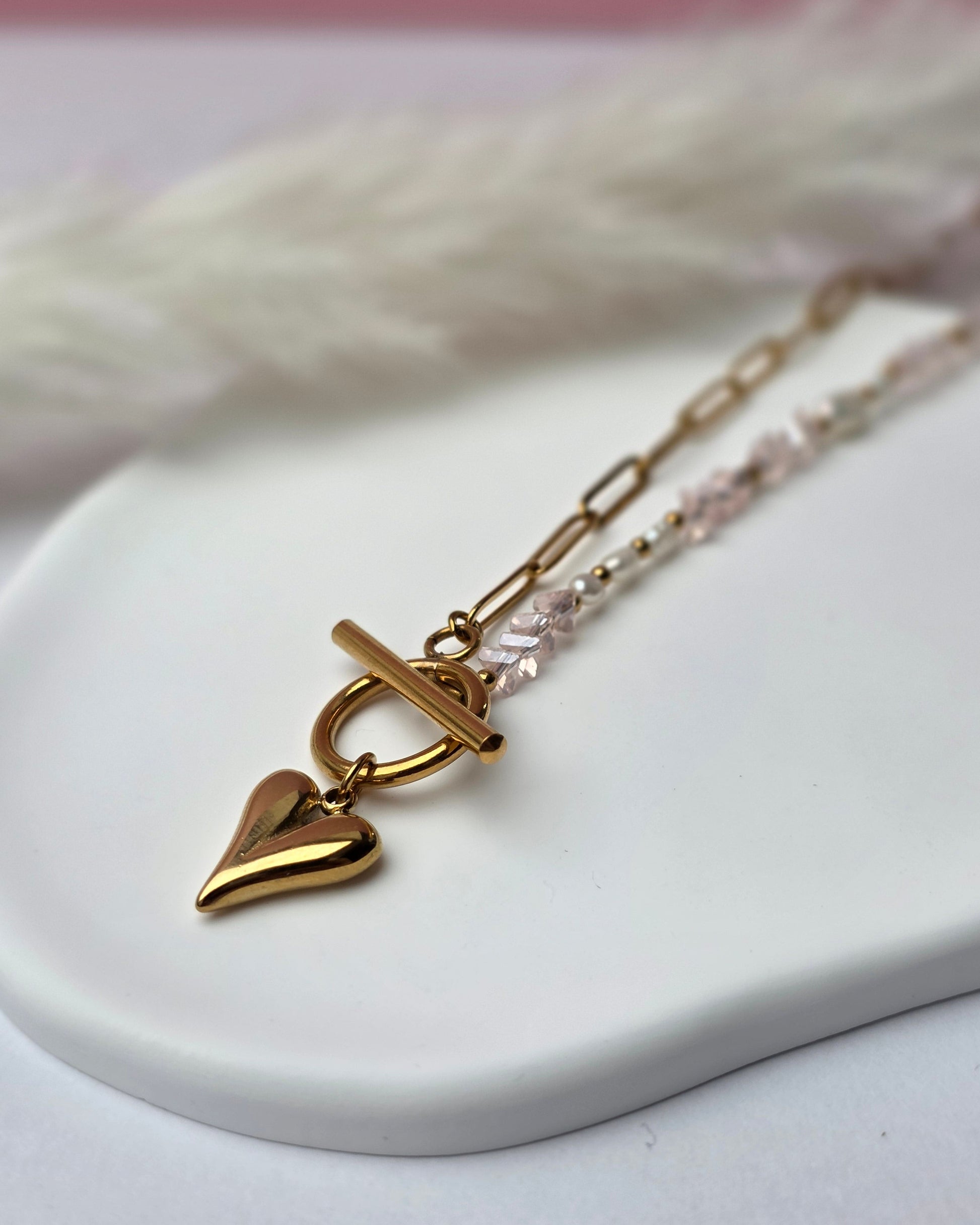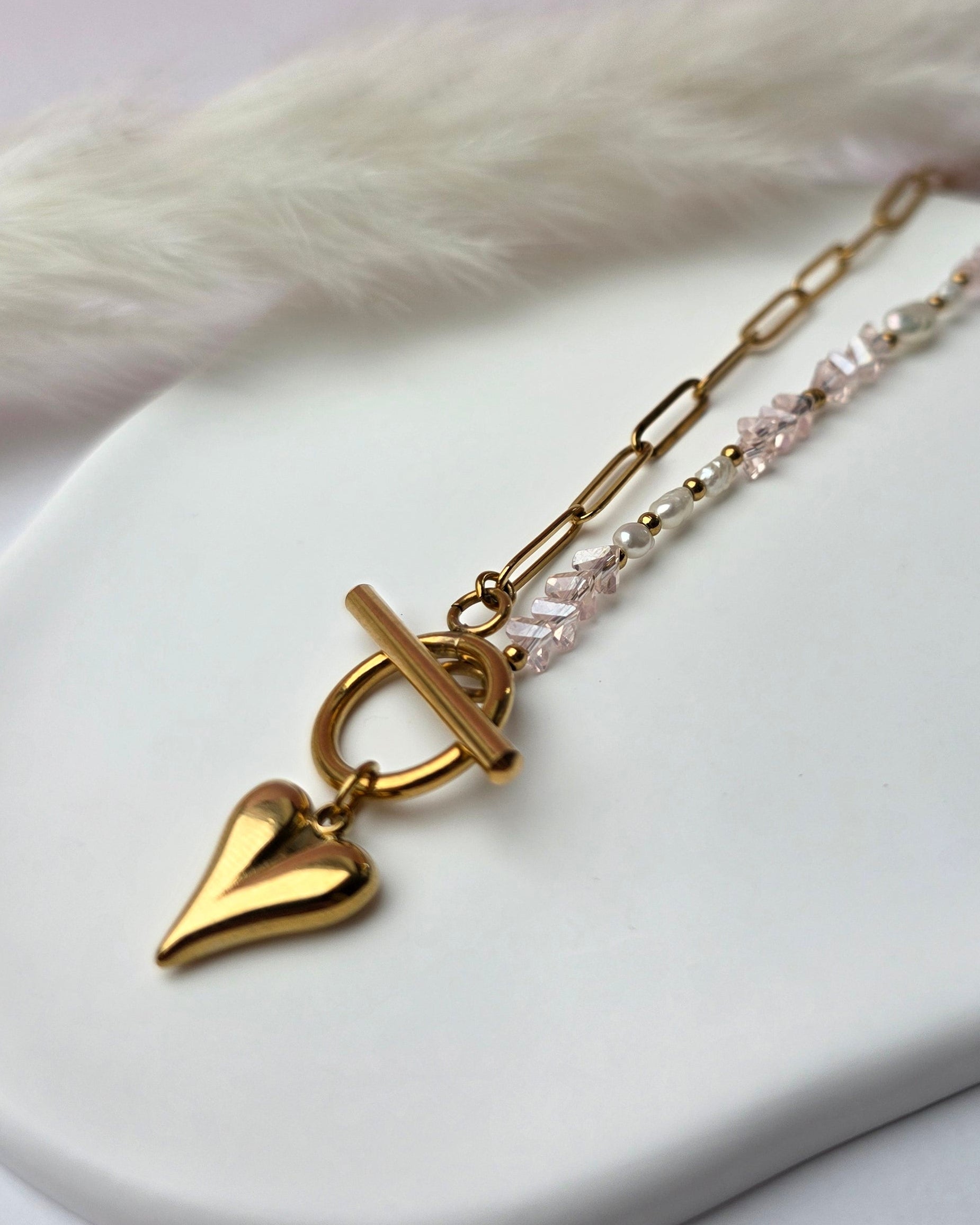 All You Need Is Love kombiniert eine moderne Edelstahl-Gliederkette mit funkelnden rosafarbenen Perlen in besonderer Form und kleinen klassischen Perlen als feine Details.