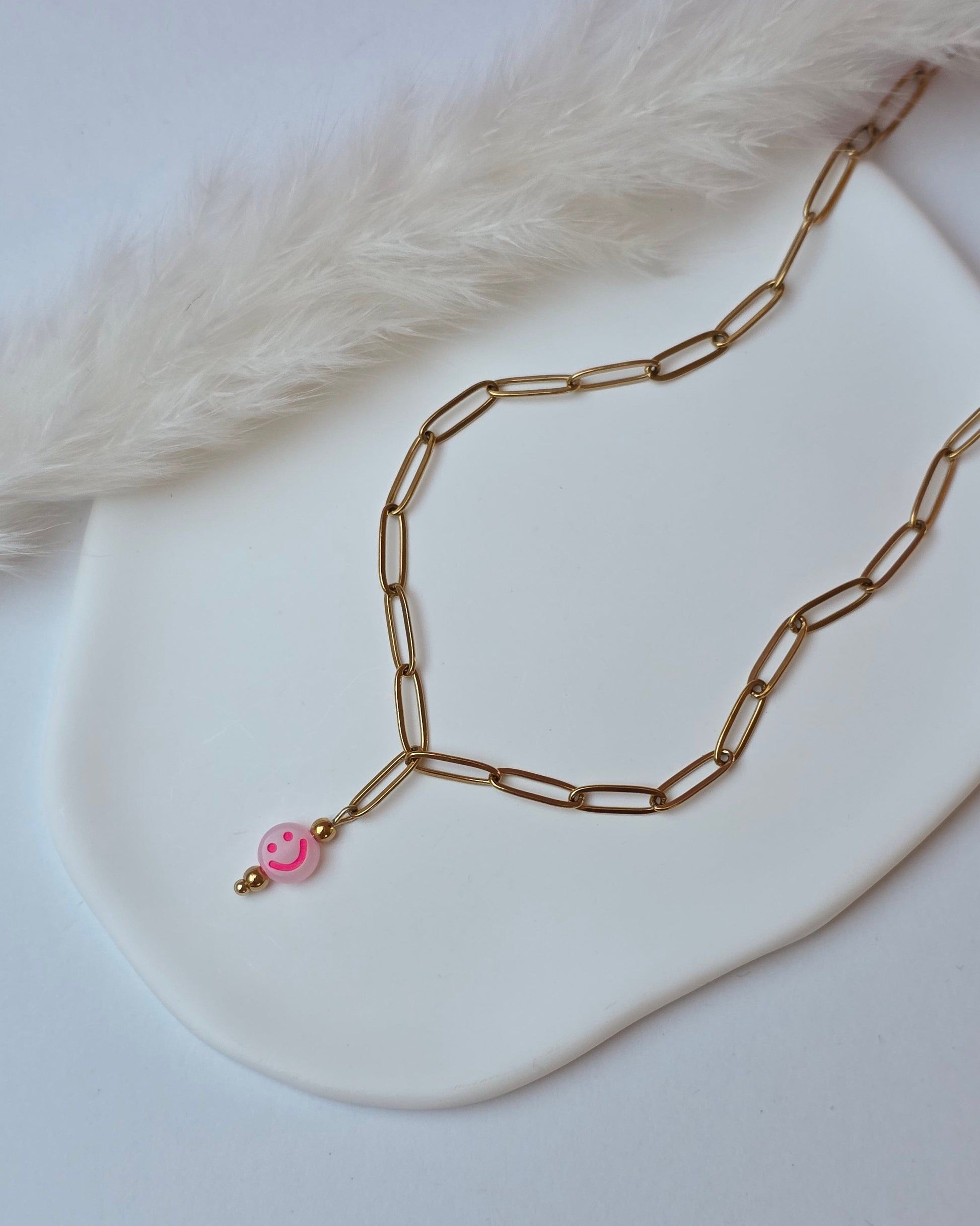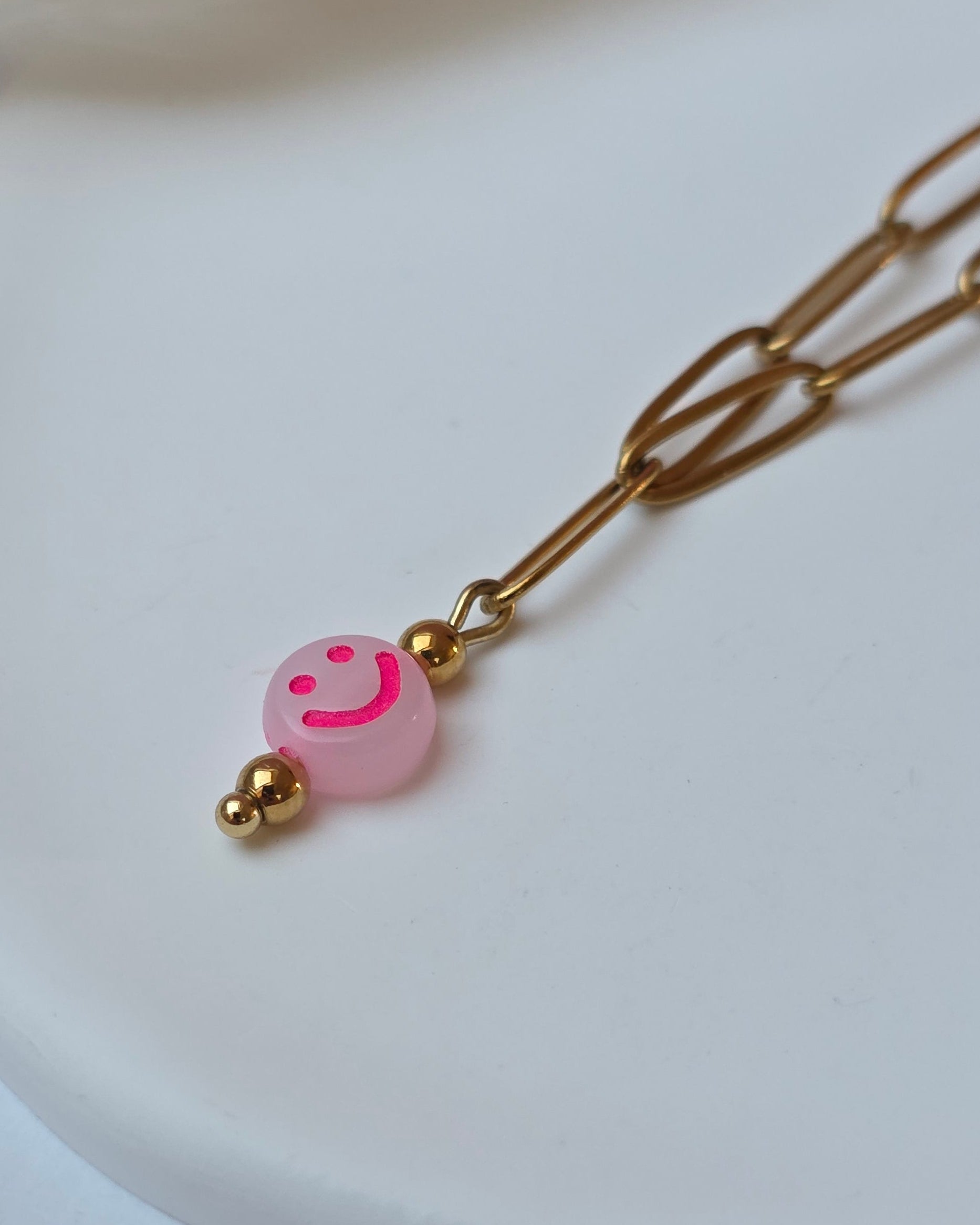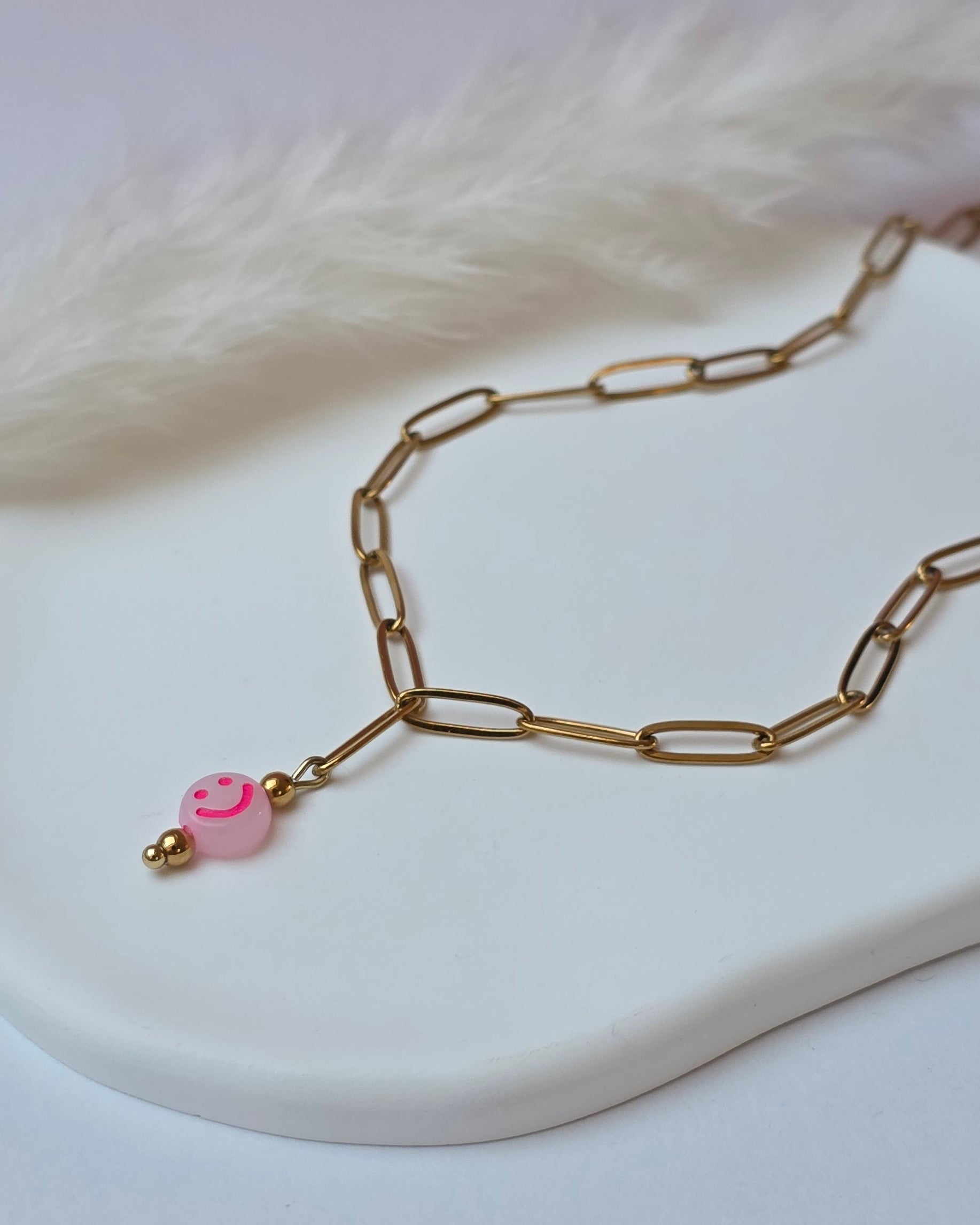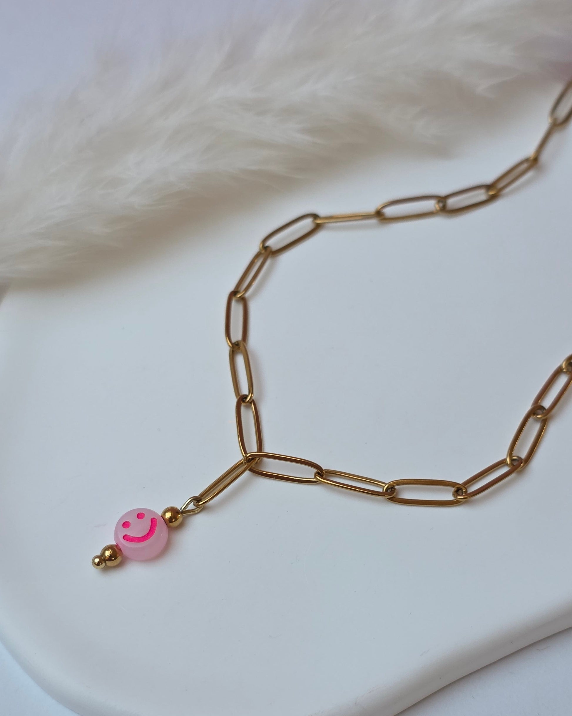Be Happy ist eine Edelstahlgliederkette, in deren Mitte ein kleiner Neon-Smiley sitzt. Ein reduziertes Design mit einem klaren Detail, das sofort ins Auge fällt und gute Laune mitbringt.