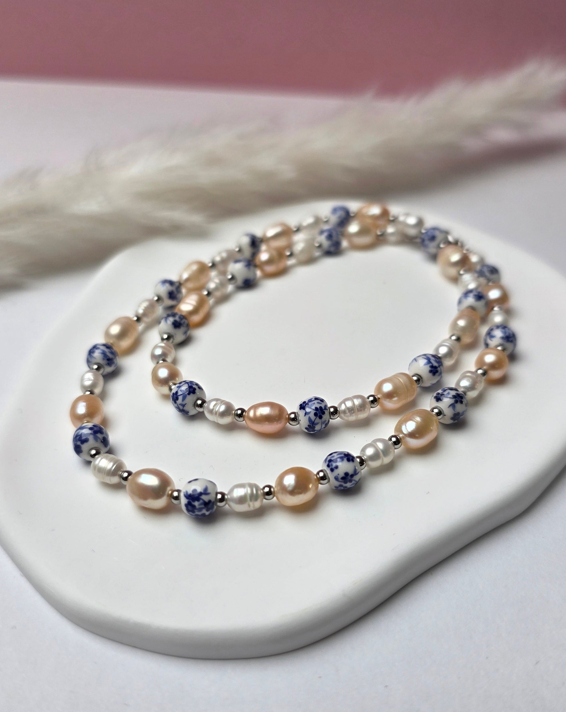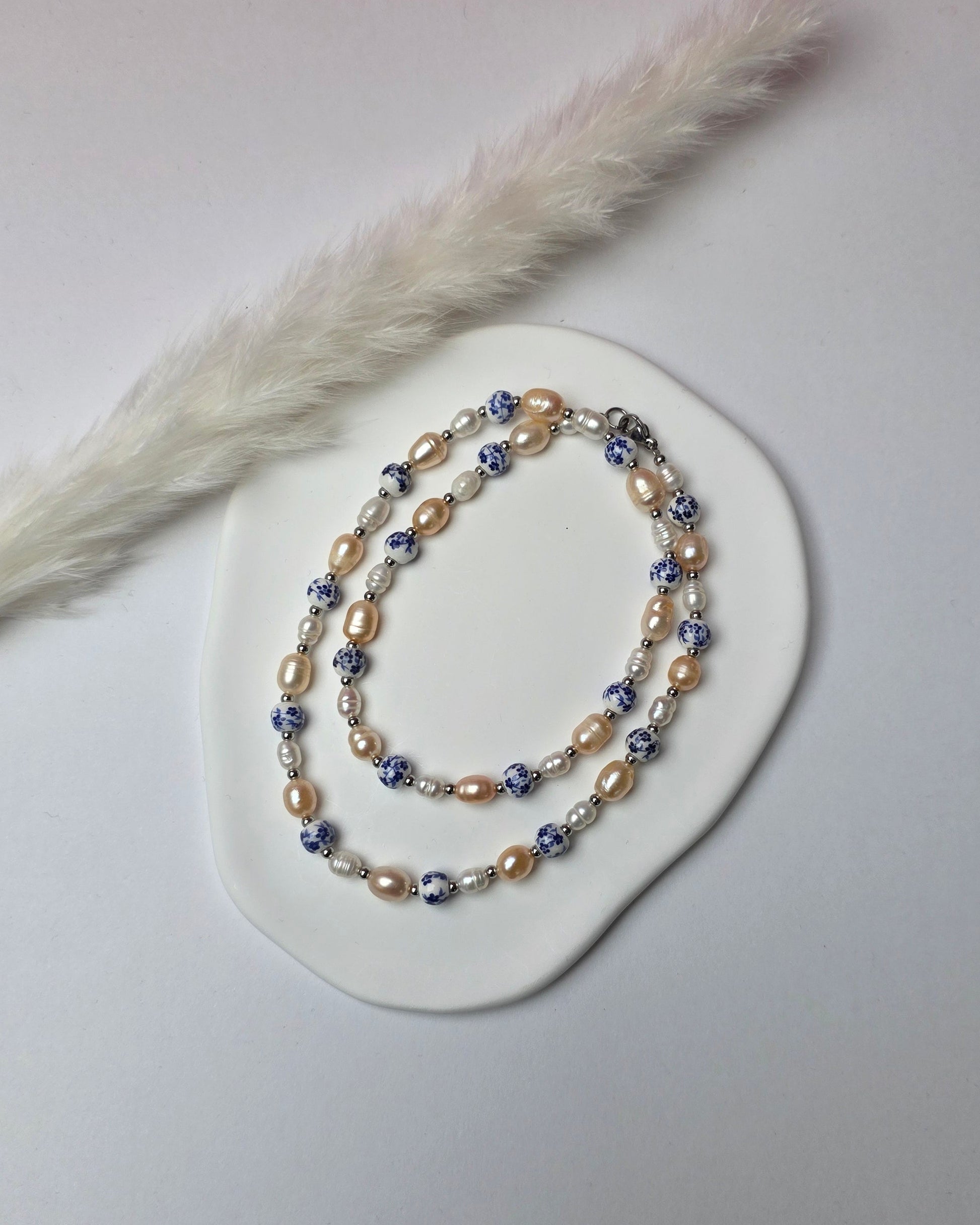 Blau-weiße florale Vintageperlen treffen auf weiße und roséfarbene Perlen und wechseln sich entlang der Kette verspielt ab.