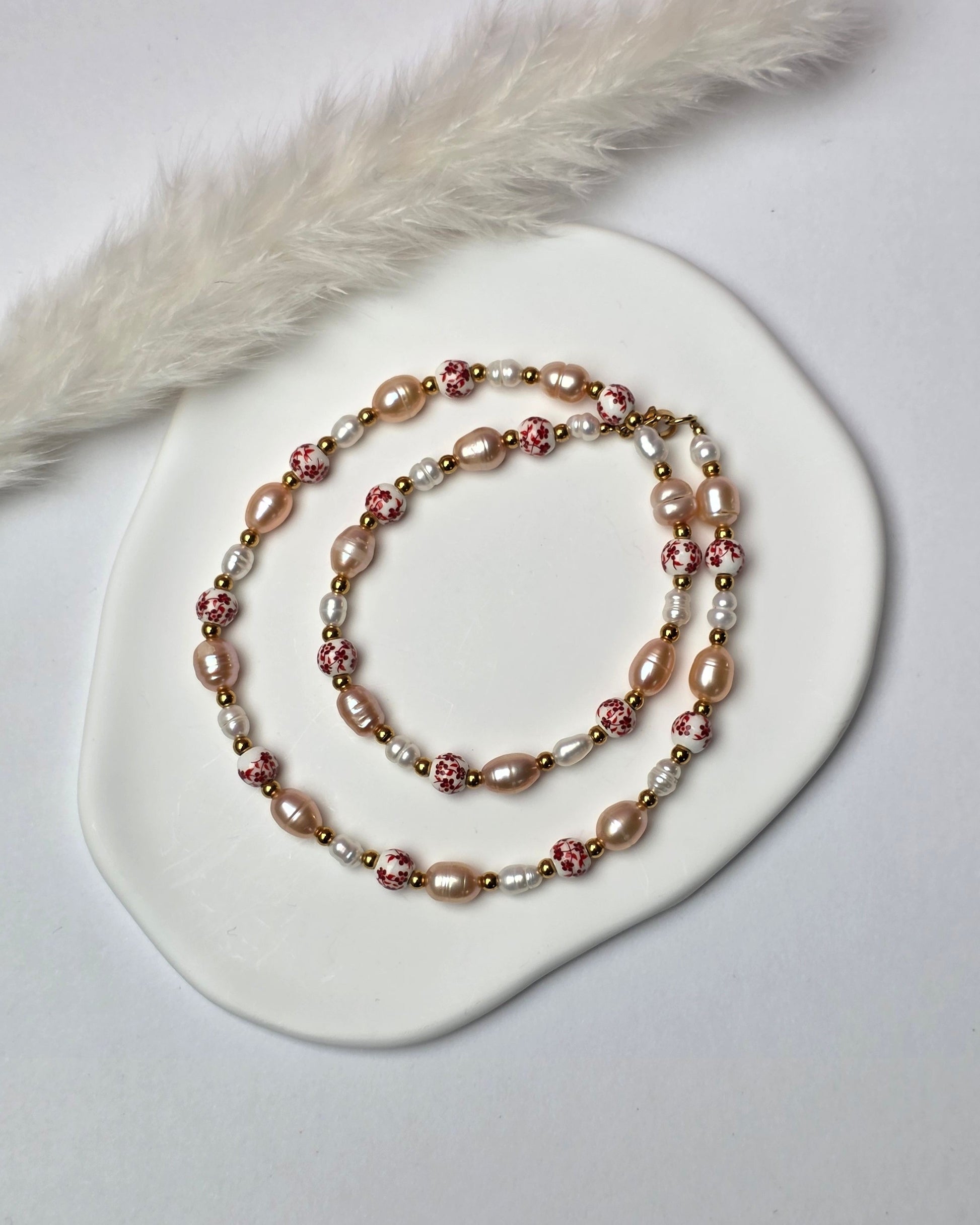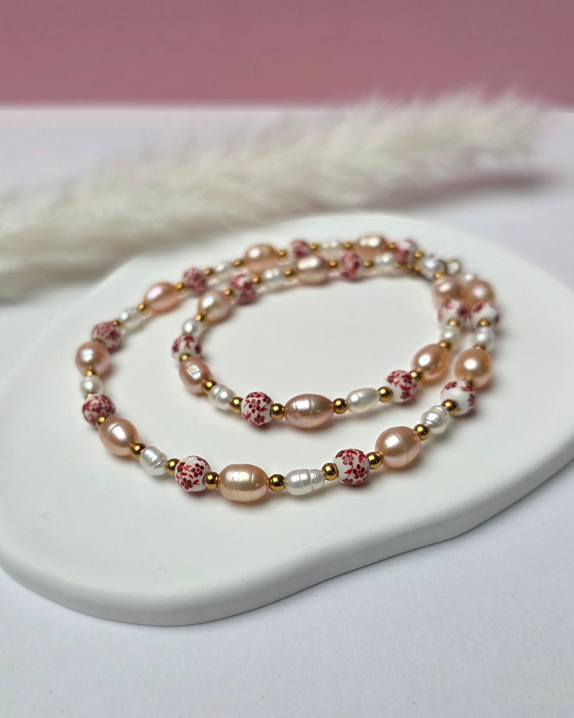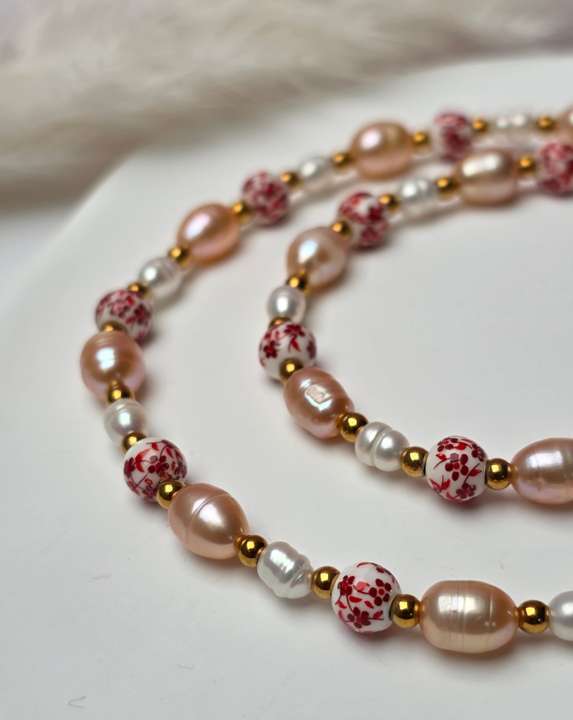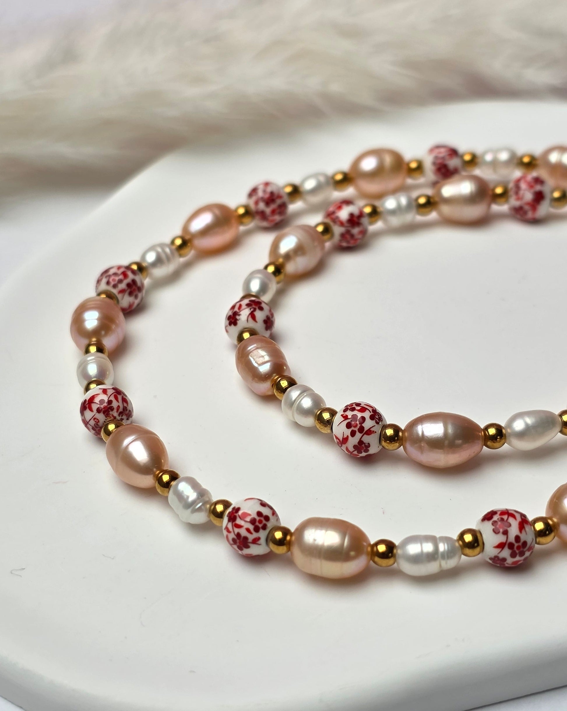 Feeling Loved greift die Idee der klassischen Perlenkette auf und übersetzt sie in eine moderne Valentine-Version. Rote florale Vintage-Perlen wechseln sich mit weißen und roséfarbenen Perlen ab und verleihen der Kette eine feminine, besondere Ausstrahlung. Die Kombination wirkt verspielt, elegant und selbstbewusst – eine klassische Perlenkette neu gedacht, mit ganz viel Gefühl und Charakter.
