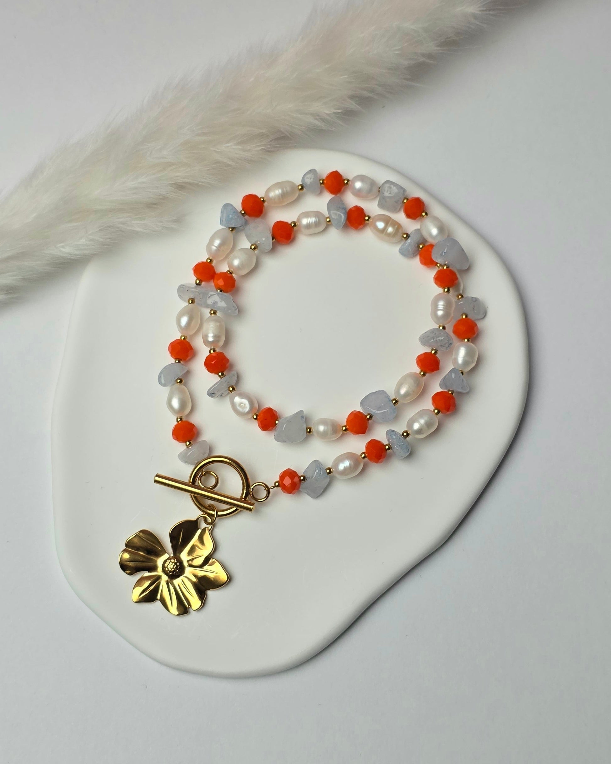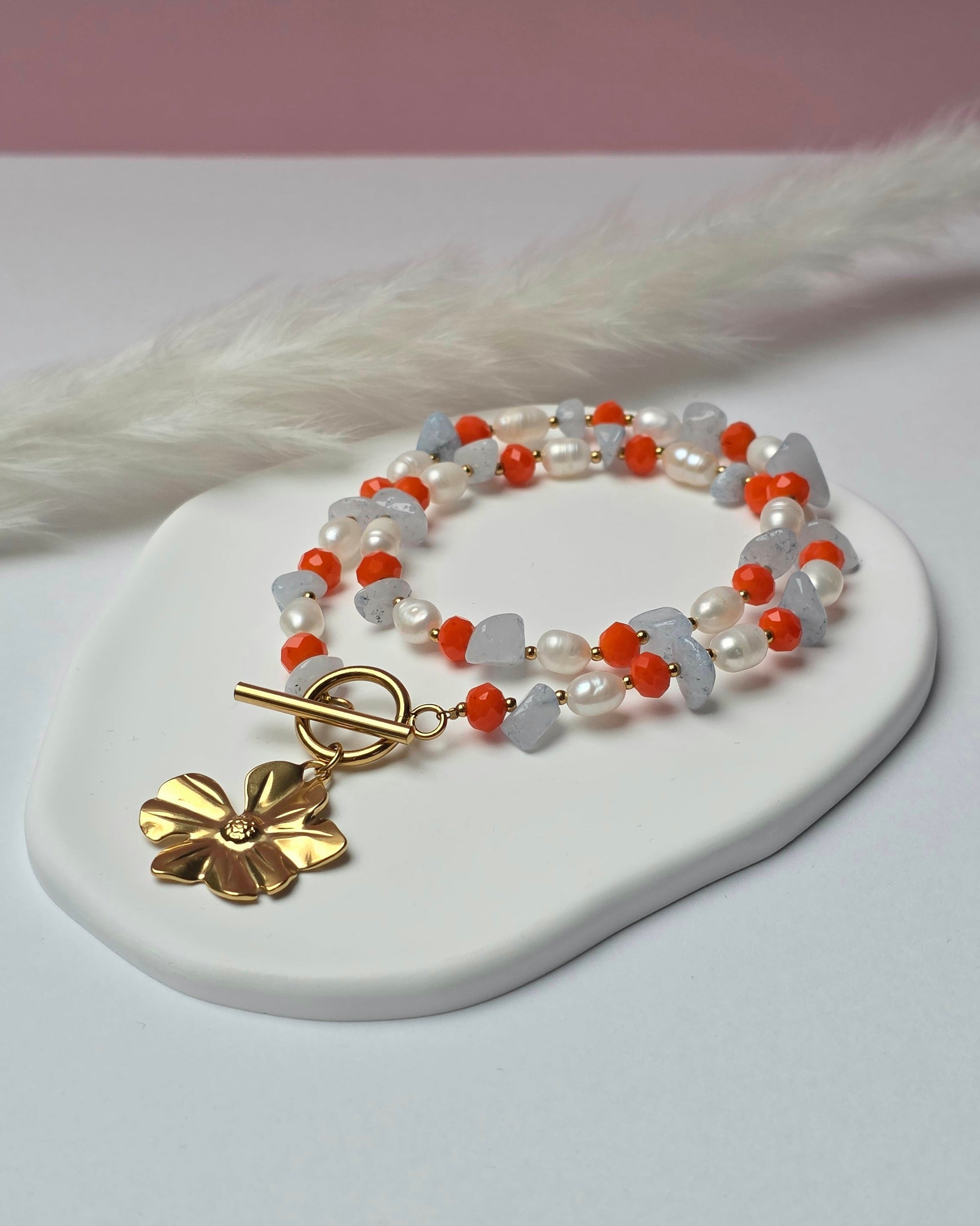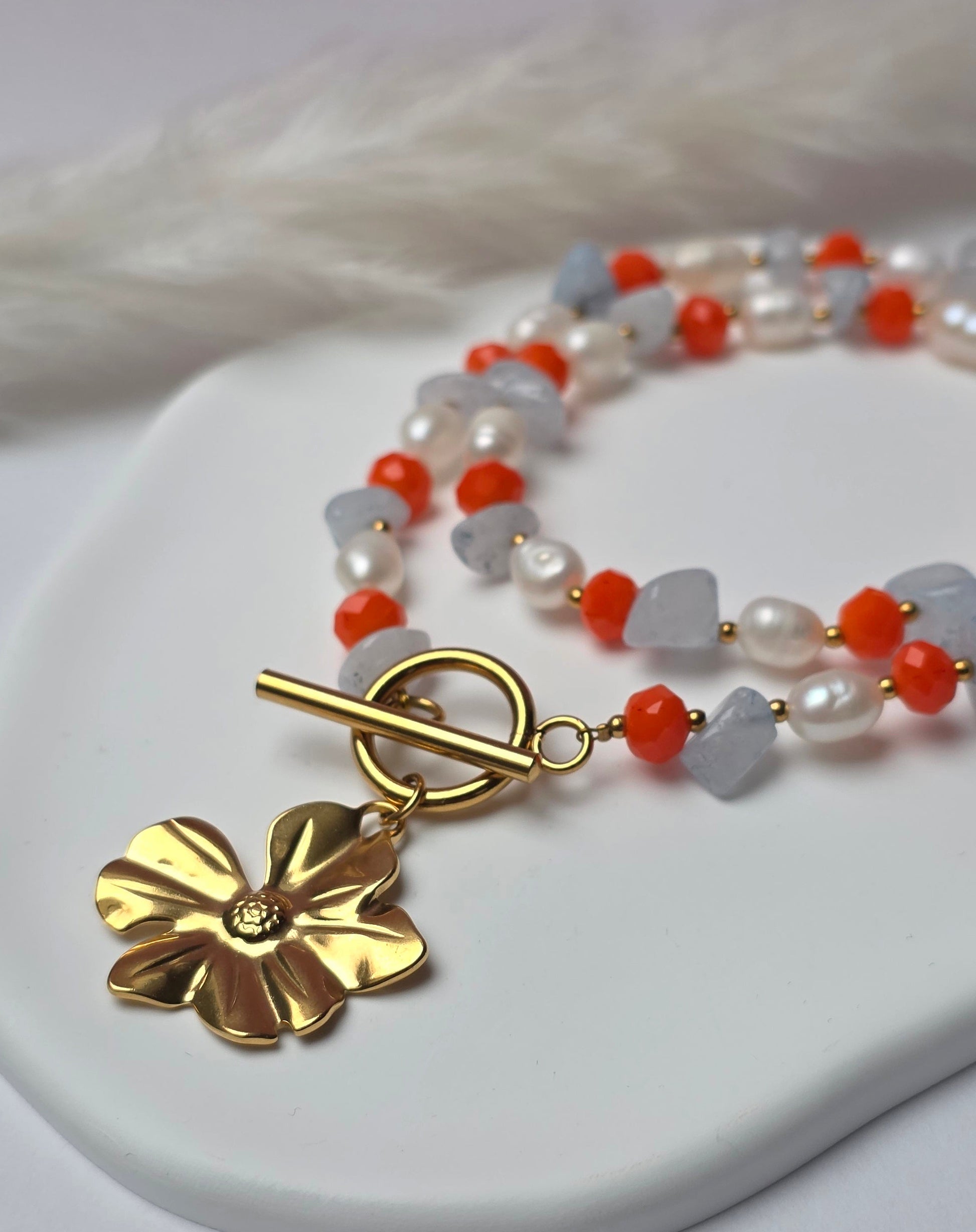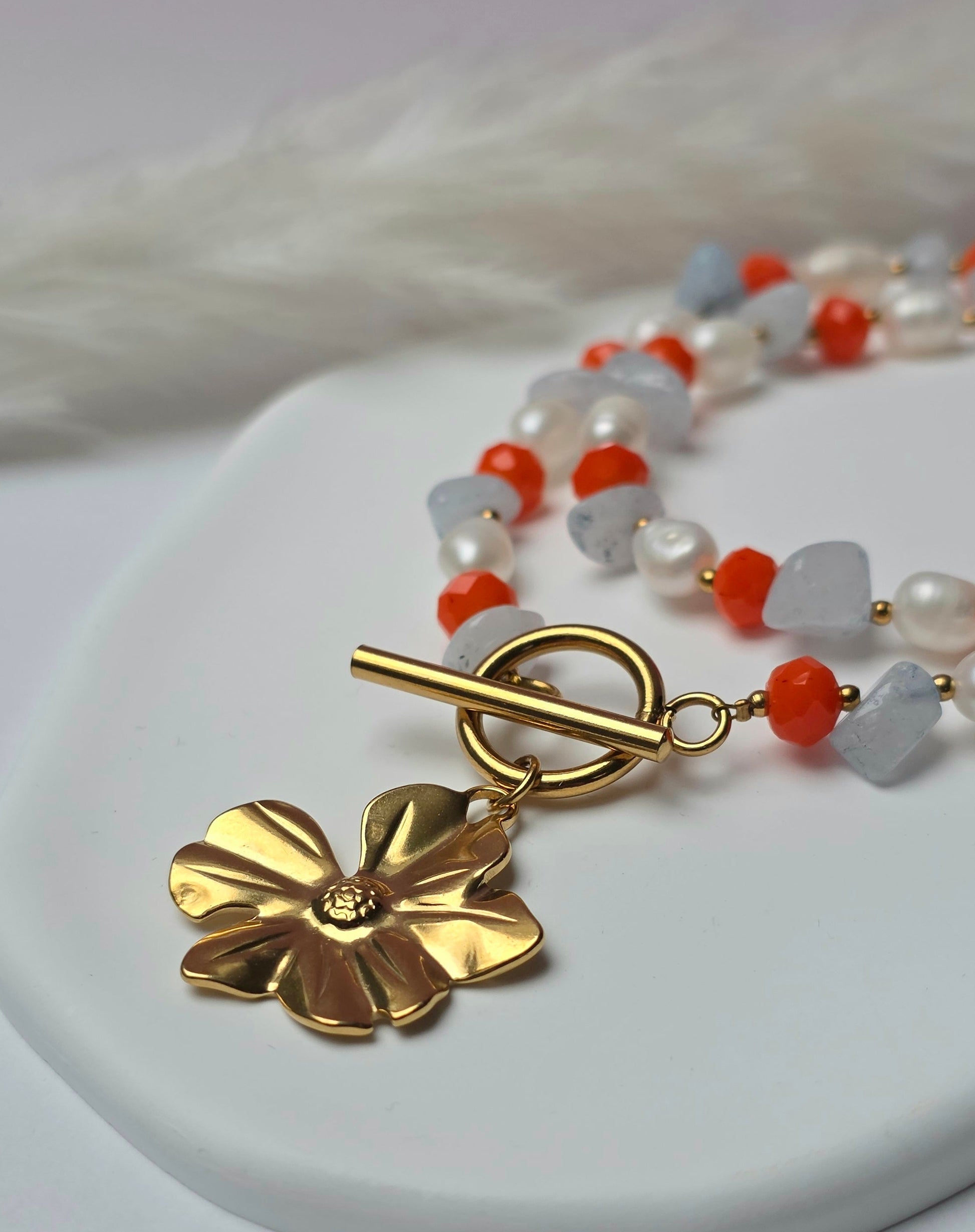 Flower Power ist eine durchgehende Perlenkette mit einem ausdrucksstarken Mix aus knallkorallroten Perlen, unregelmäßigen hellblauen Aquamarinperlen und klassischen weißen Perlen. Die Farben wechseln sich entlang der Kette ab und sorgen für einen unverwechselbaren, lebendigen Look. Vorne wird die Kette mit einem Knebelverschluss geschlossen und durch einen Blumenanhänger ergänzt.