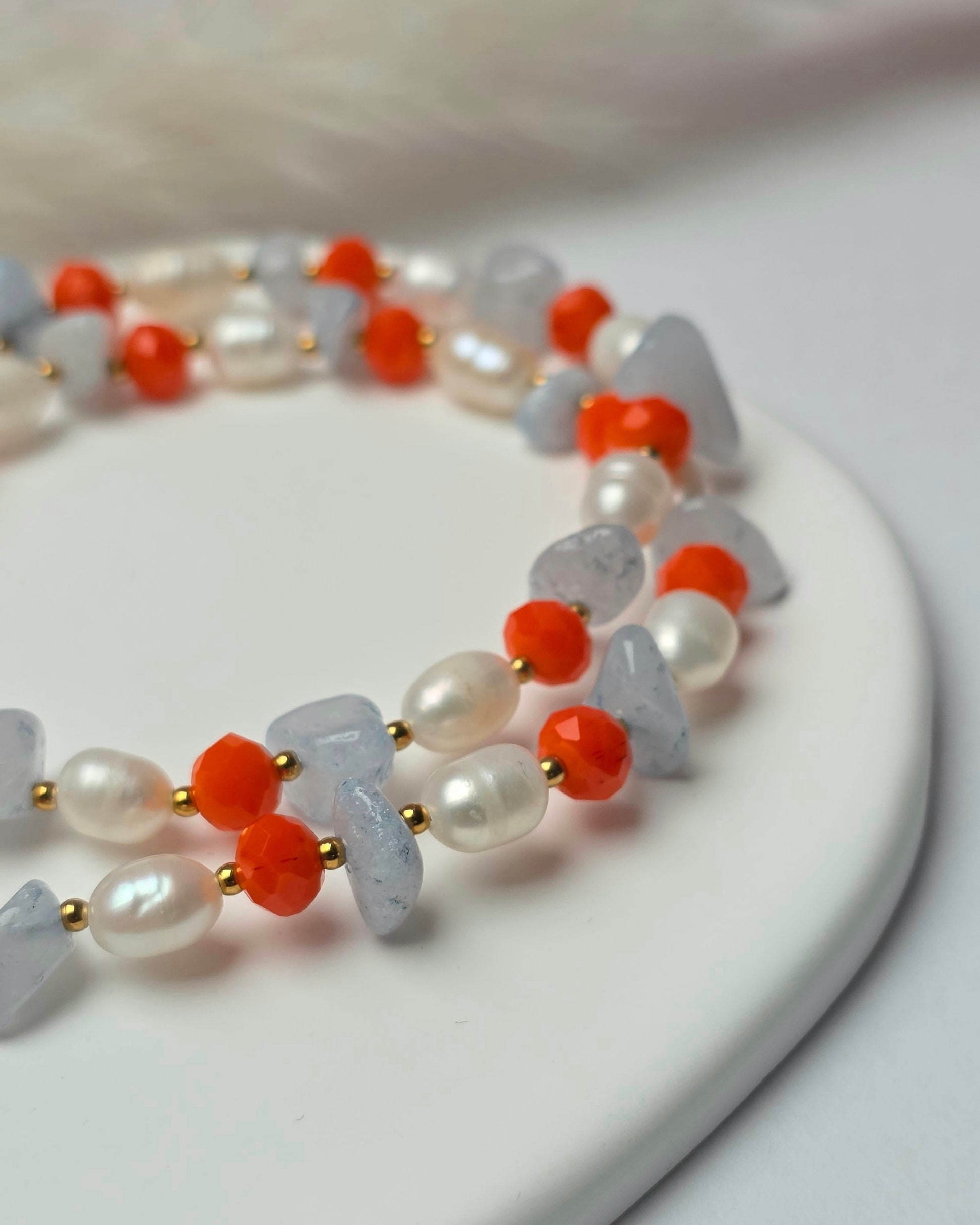 Die Kombination aus kräftigen Farben und klassischen Perlen macht das Design modern, verspielt und zu einem absoluten Hingucker.