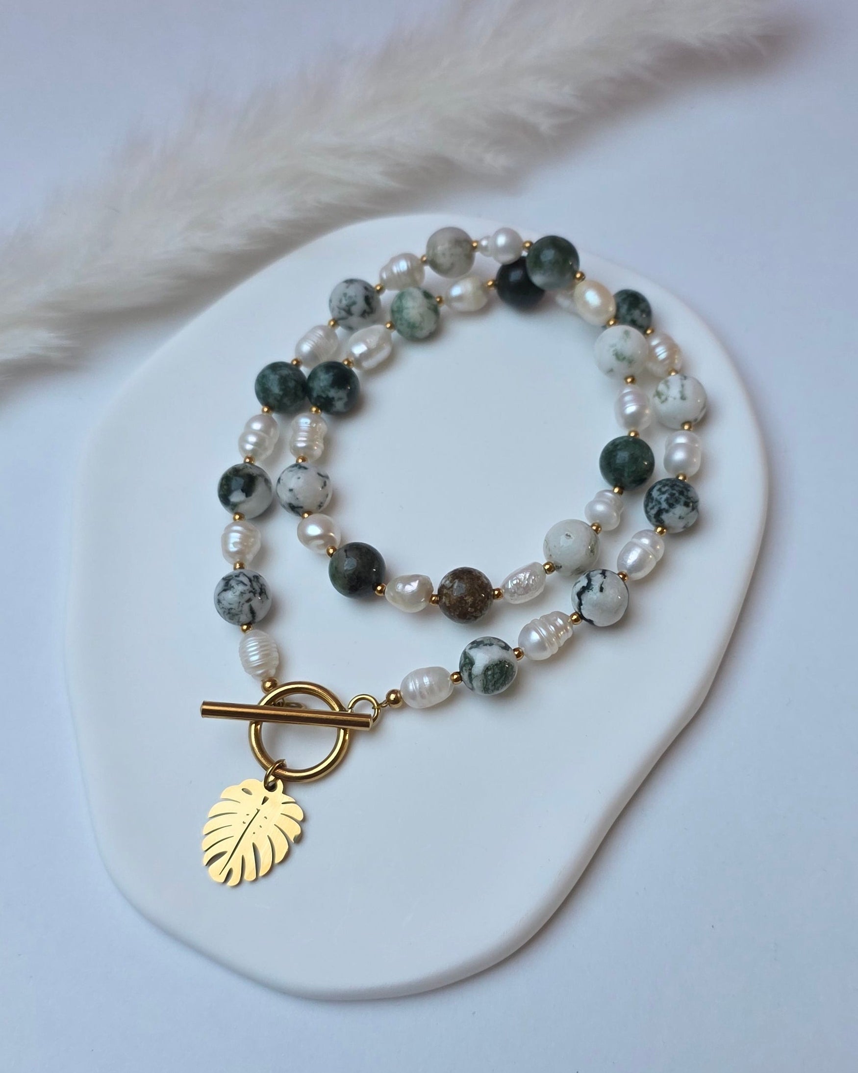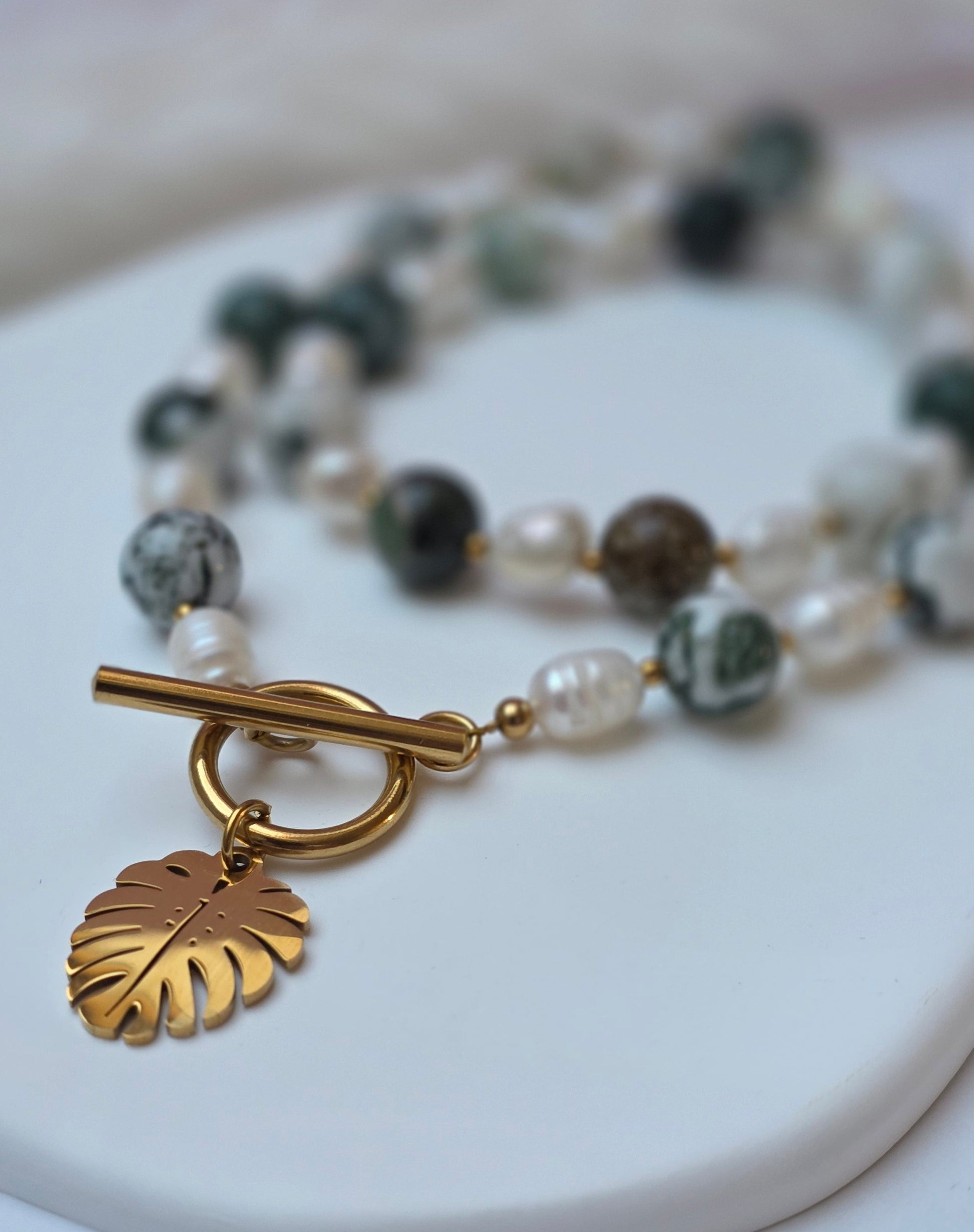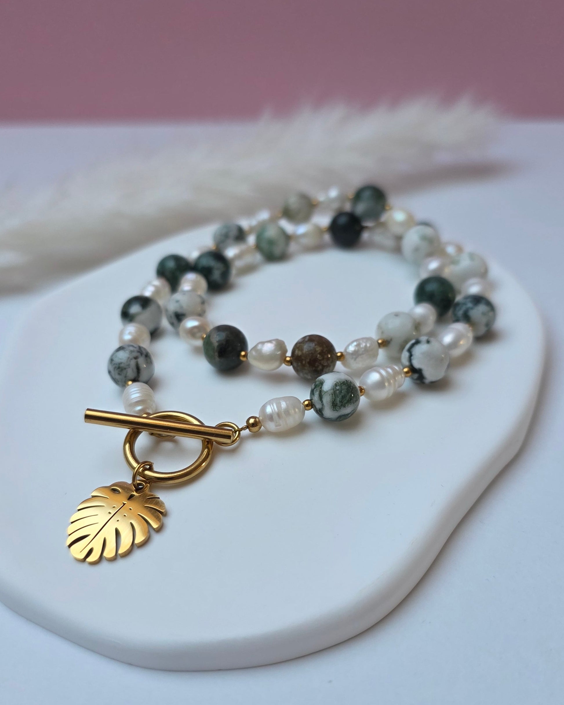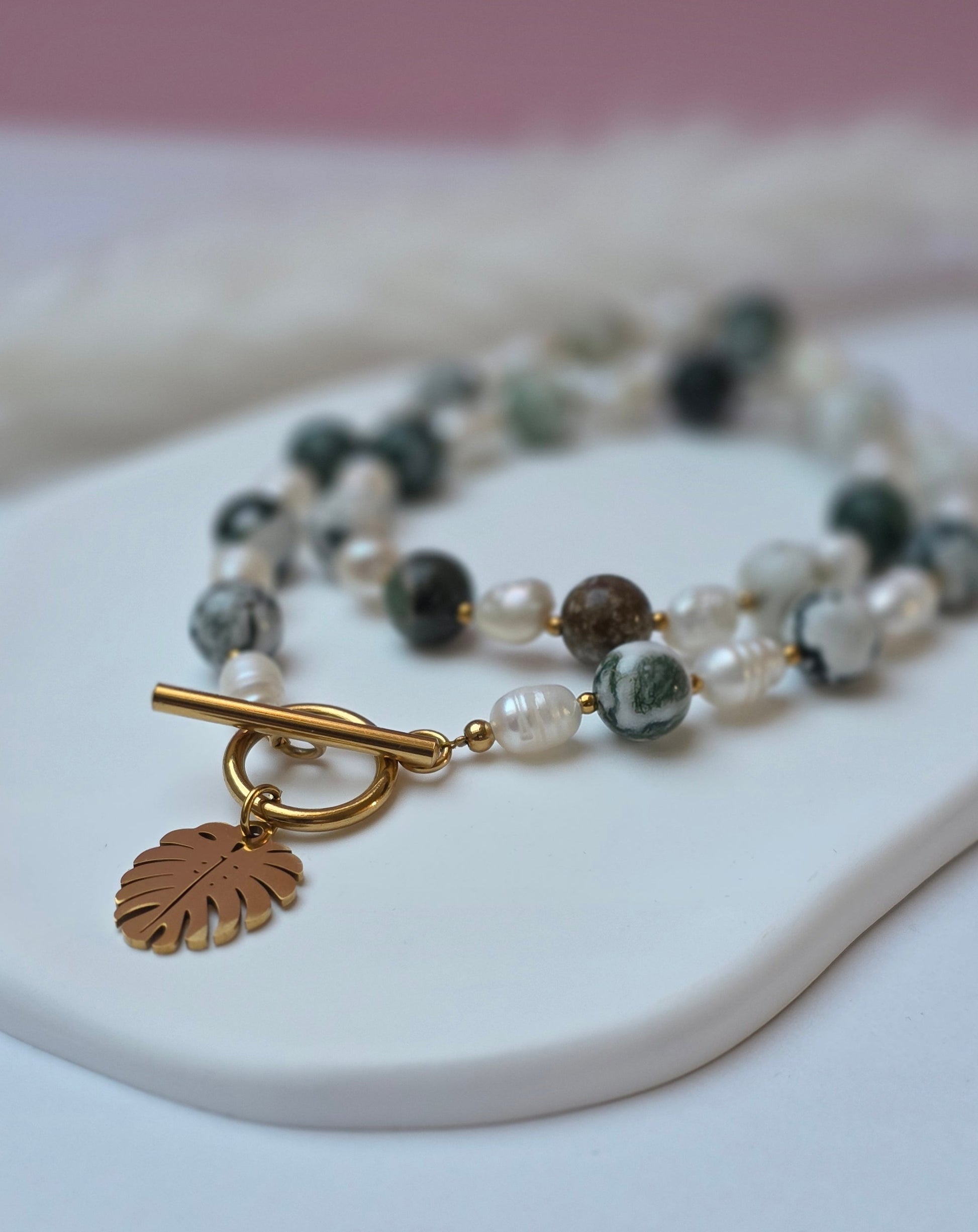 Vorne treffen die Perlen im Knebelverschluss zusammen, ergänzt durch einen Monstera-Anhänger als markantes Detail. Die Kombination aus Perlen, Grünnuancen und Anhänger verleiht dem Piece seinen unverwechselbaren Look.