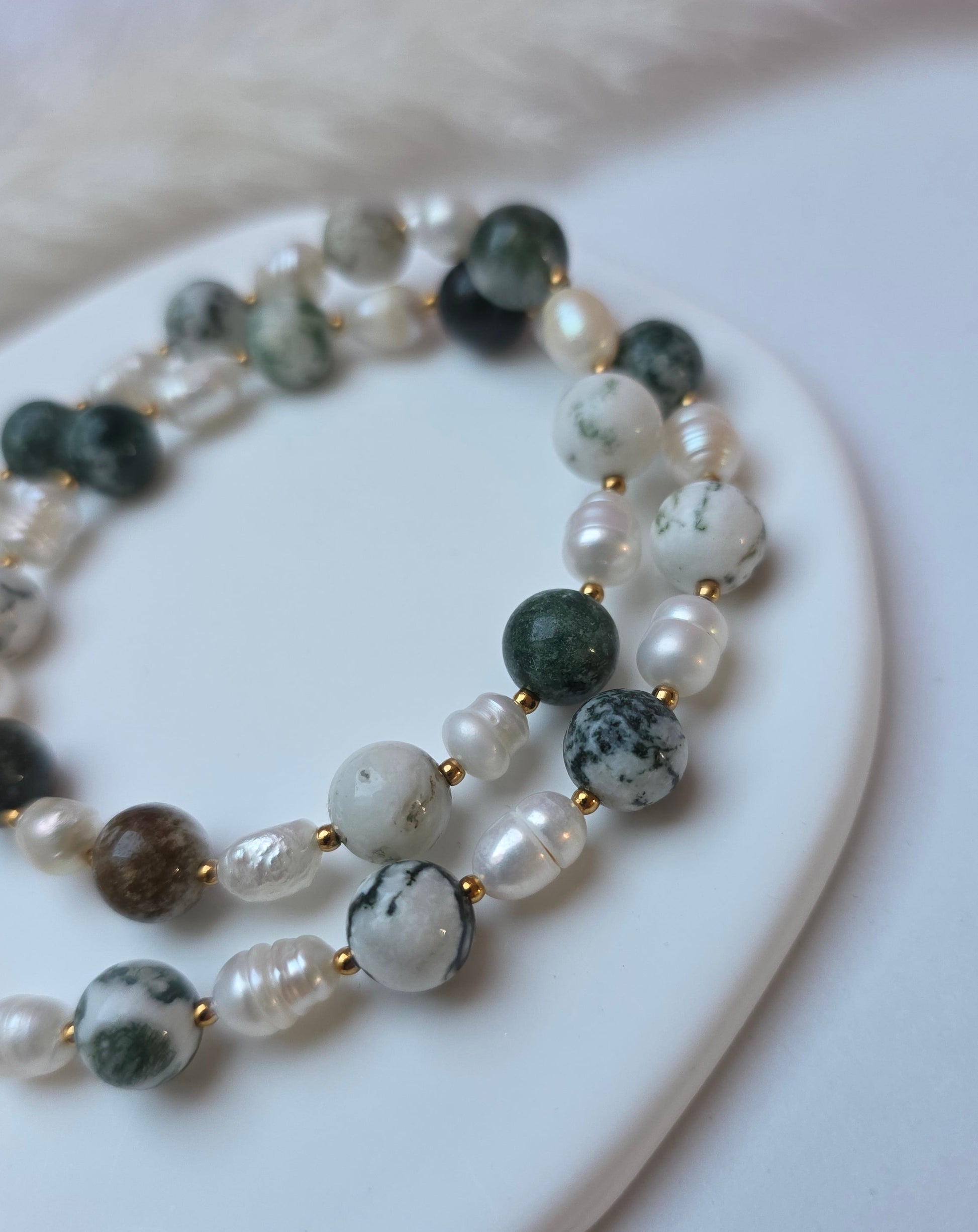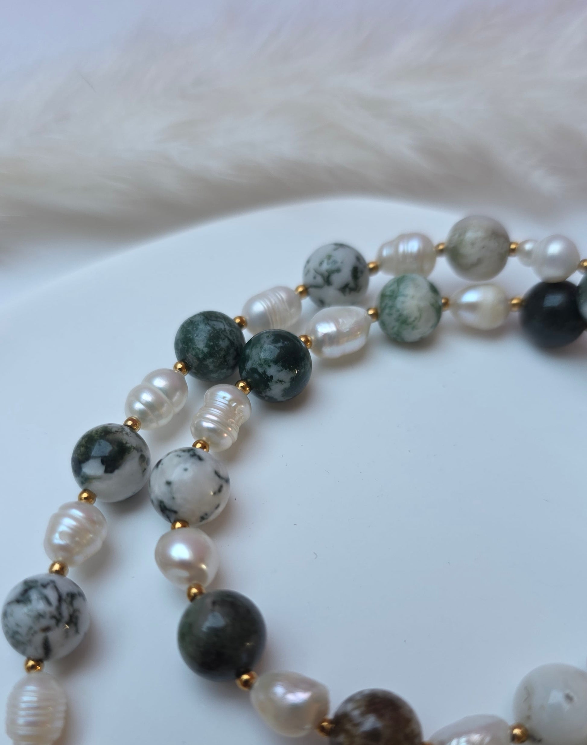 Jungle Fever ist eine Statementkette mit einem Mix aus grün-weißen Steinperlen und klassischen Perlen. Die unterschiedlichen Grüntöne bringen Tiefe ins Design und machen die Kette sofort besonders.