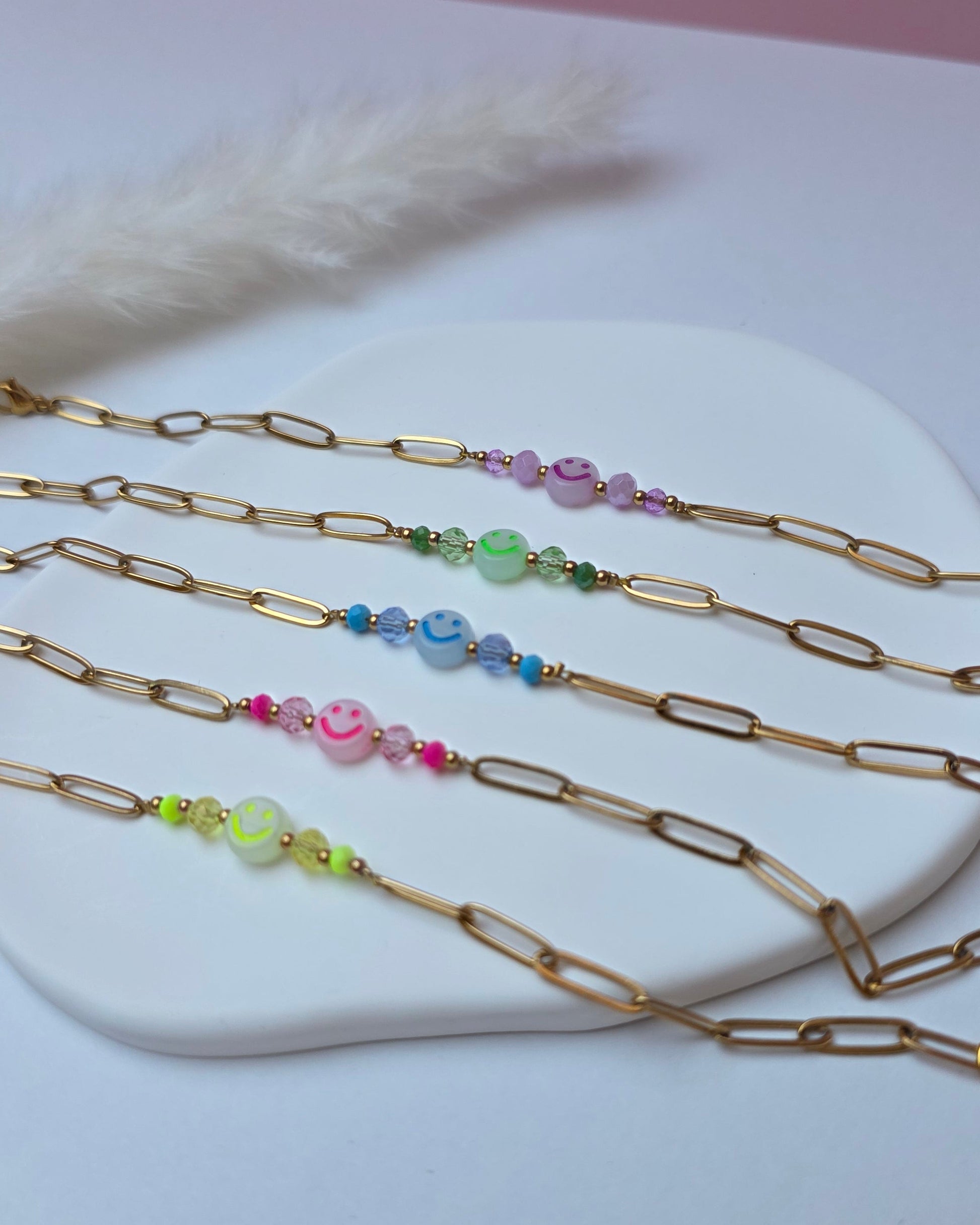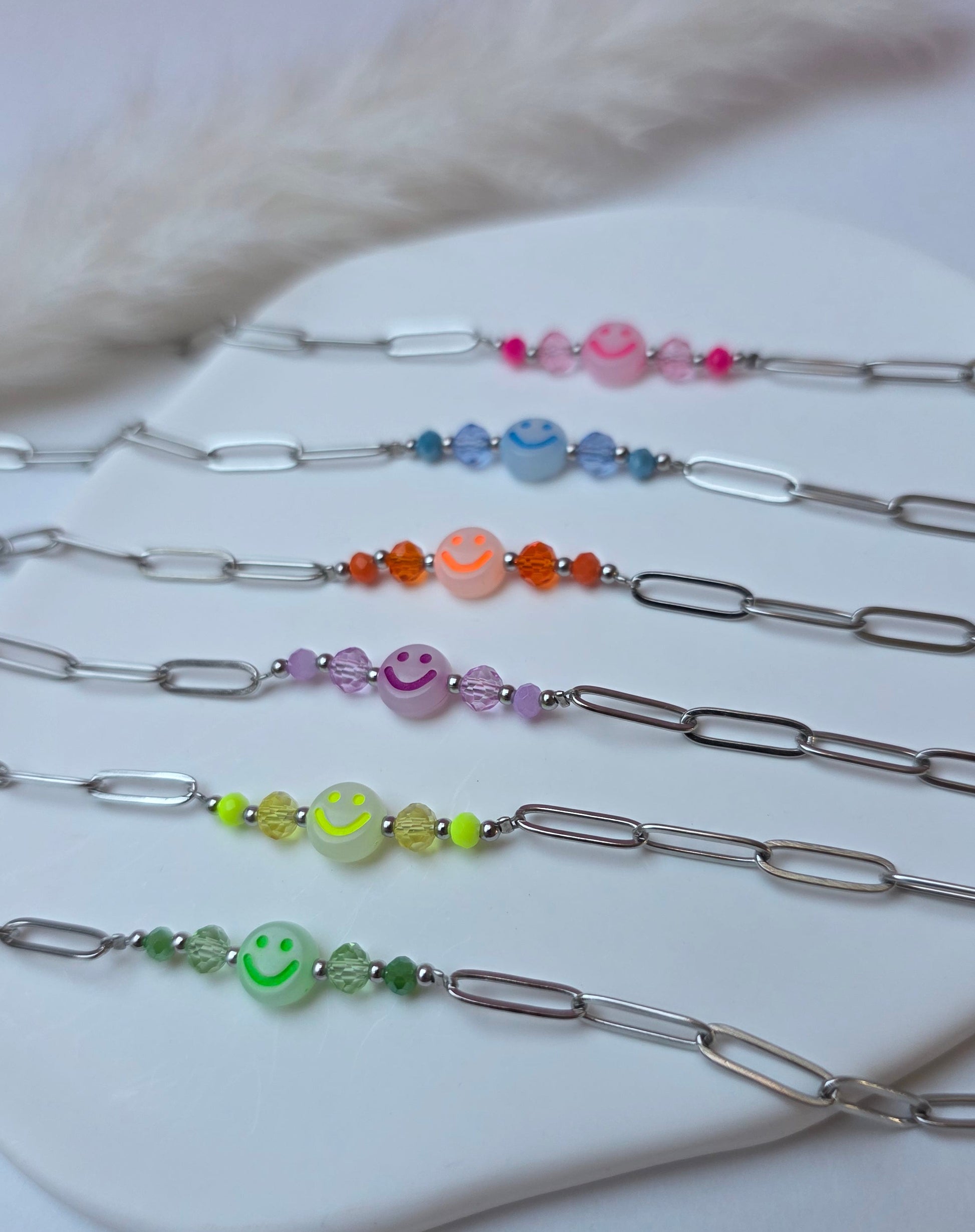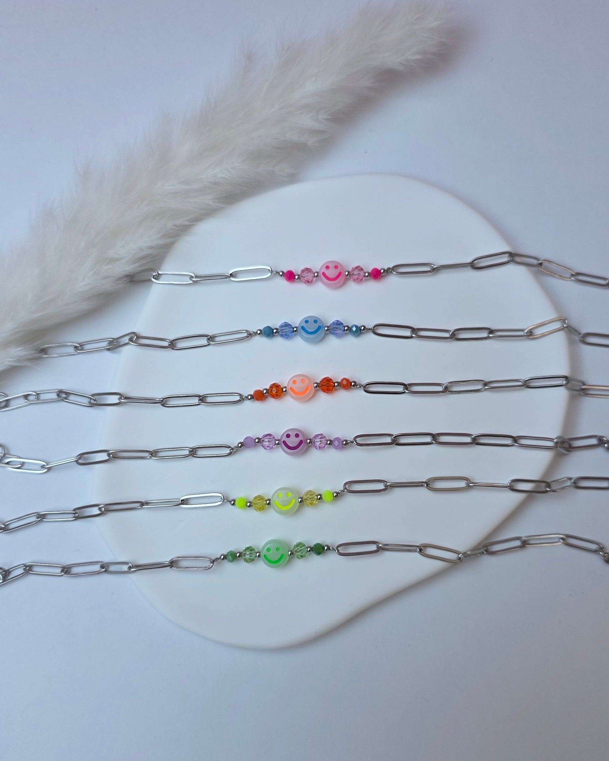 Das Armband Happy kombiniert klare Edelstahlelemente mit Neon-Smiley-Perlen und kleinen Farbdetails und setzt damit einen frischen, auffälligen Akzent. Jede Variante bringt ihren eigenen Vibe mit und macht das Piece zu einem kleinen Mood-Booster im Alltag.