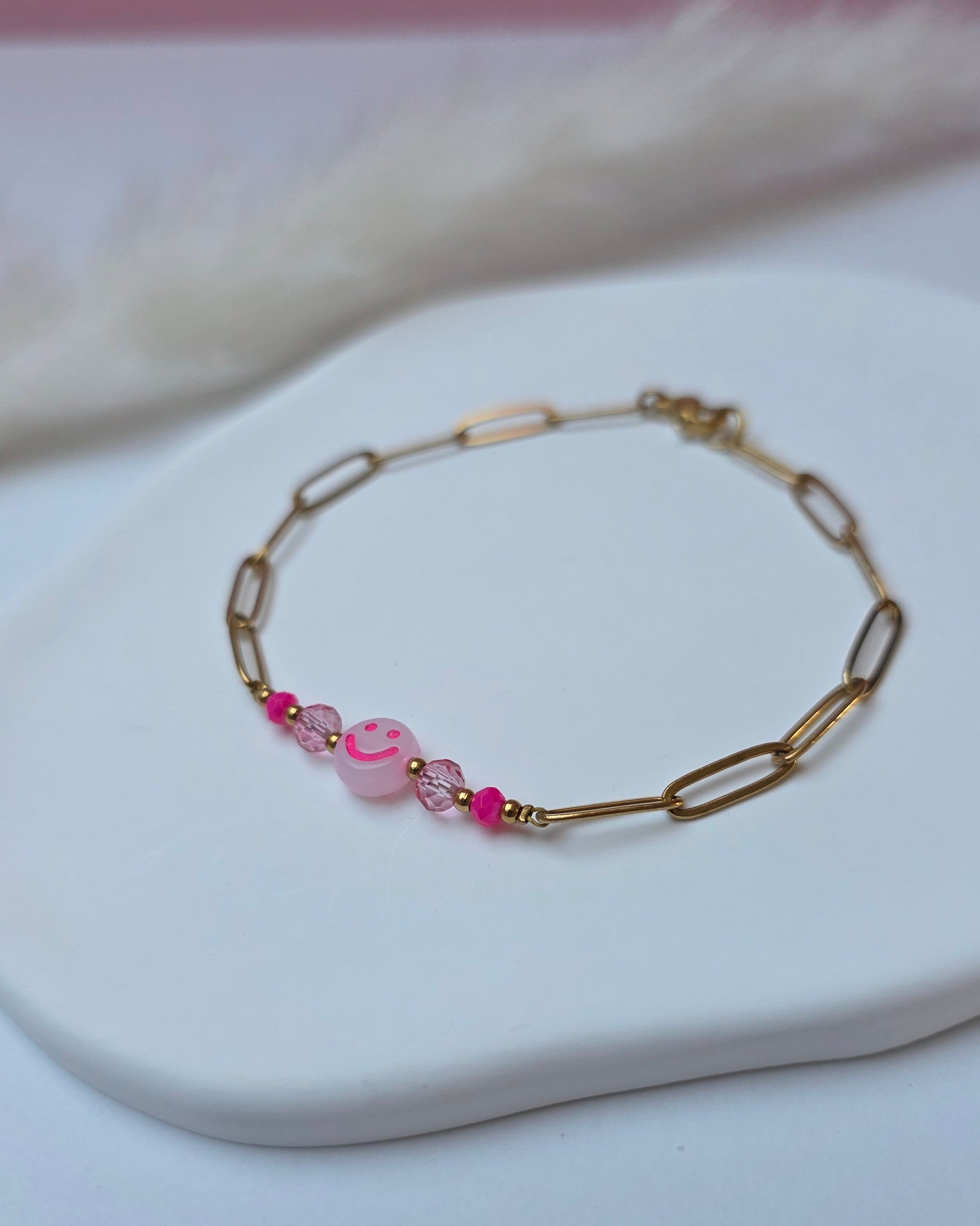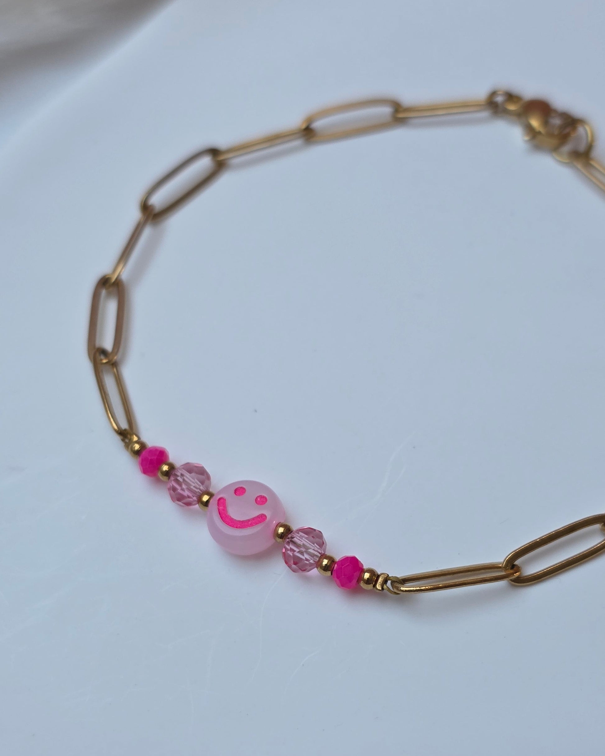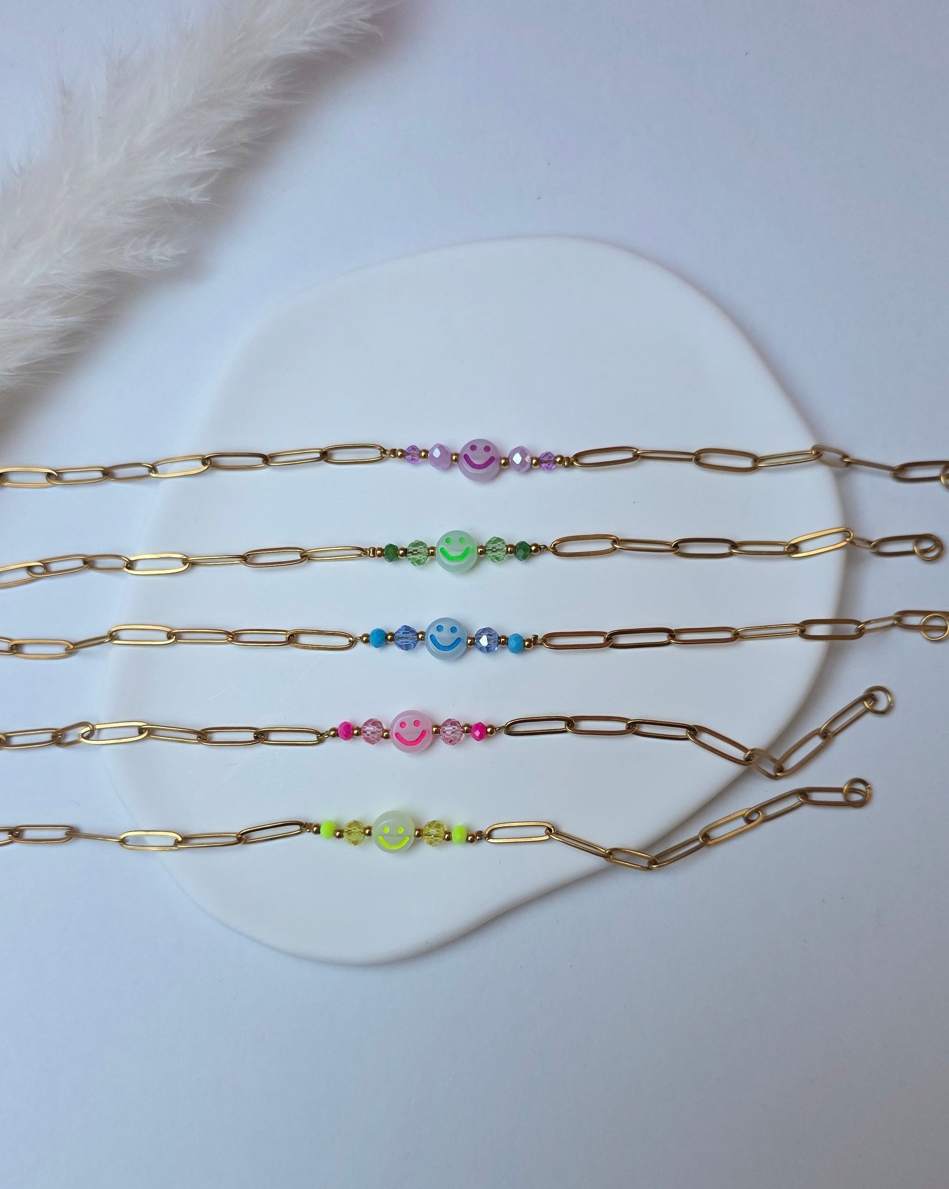 Das Armband Happy kombiniert klare Edelstahlelemente mit Neon-Smiley-Perlen und kleinen Farbdetails und setzt damit einen frischen, auffälligen Akzent. Jede Variante bringt ihren eigenen Vibe mit und macht das Piece zu einem kleinen Mood-Booster im Alltag.
