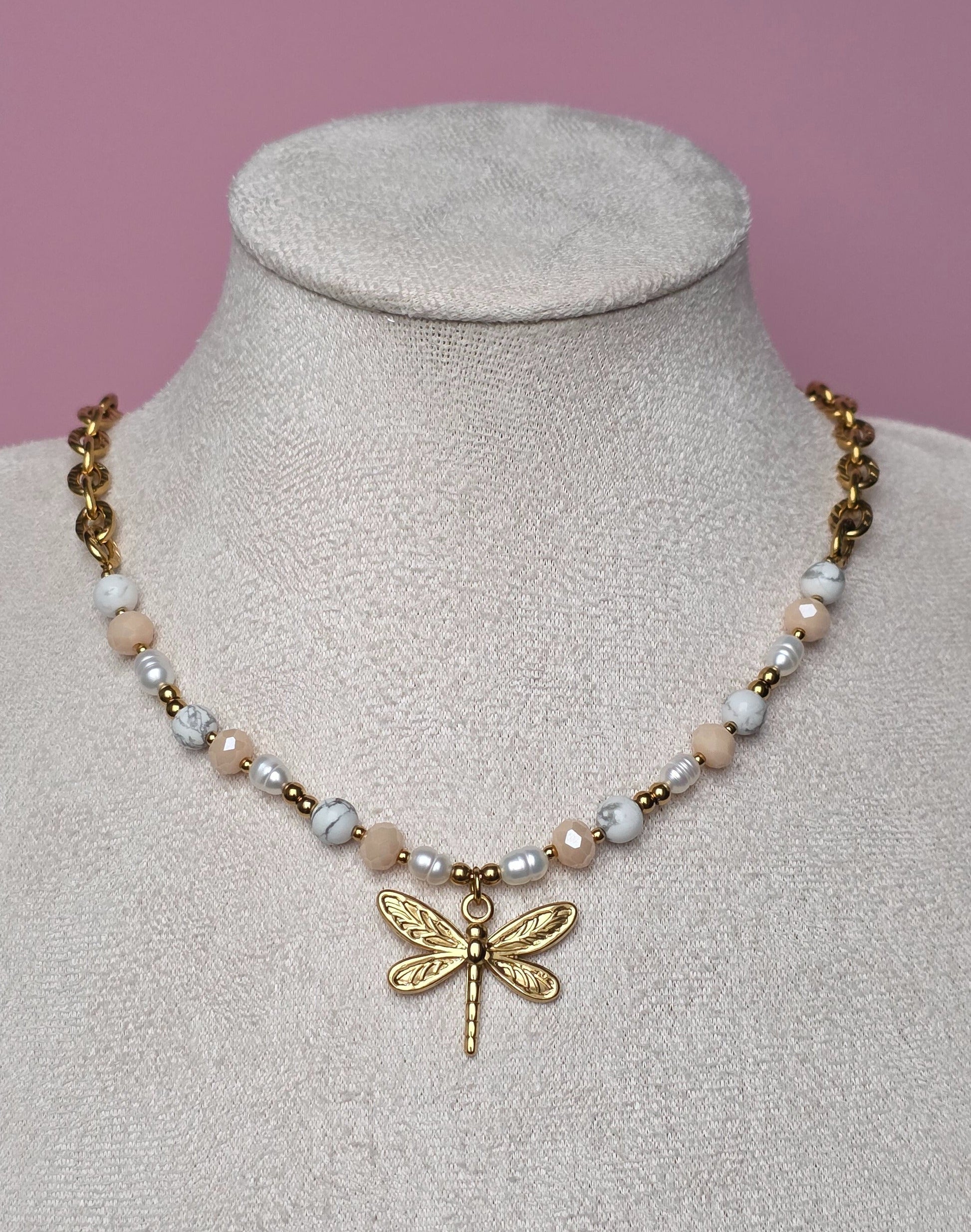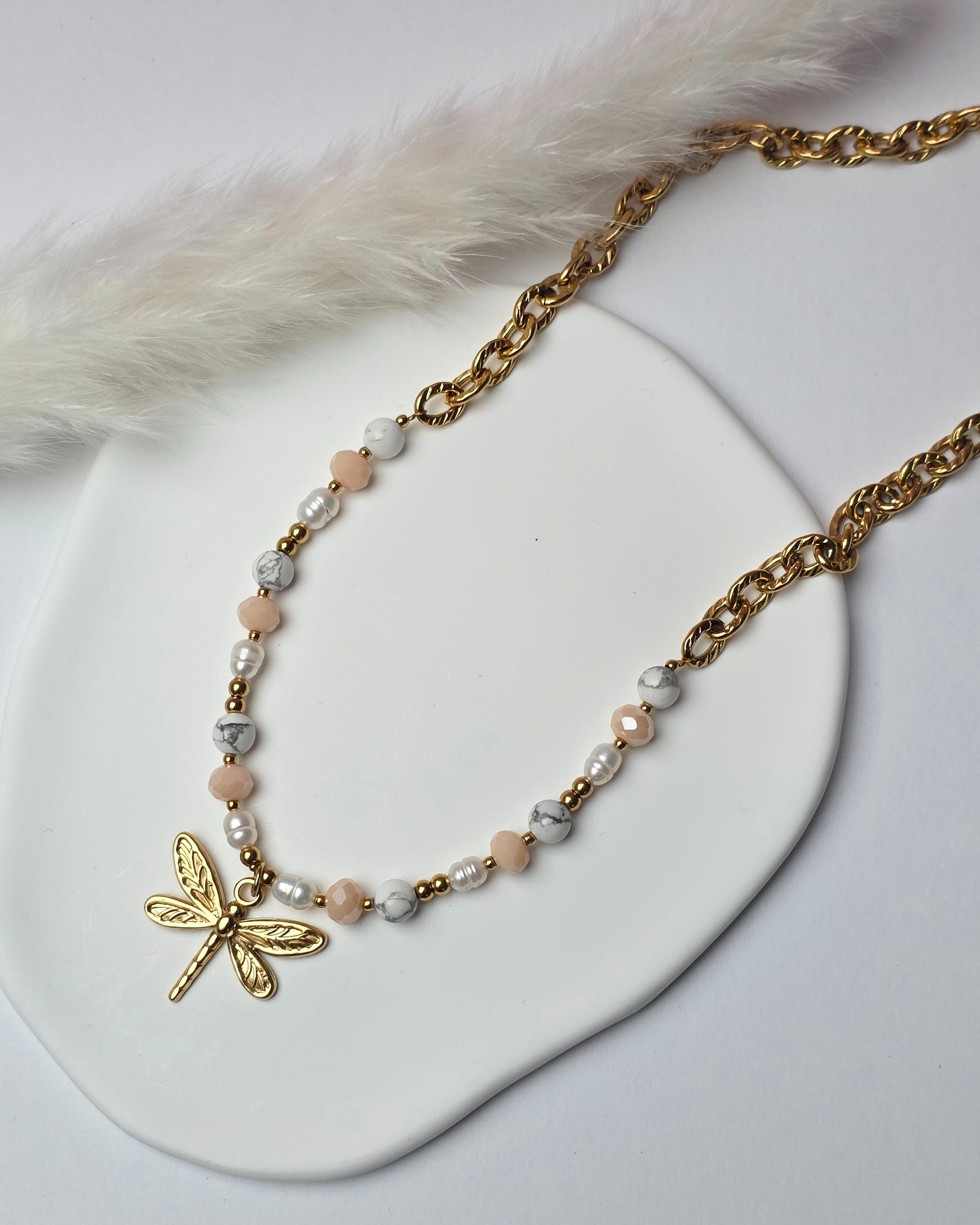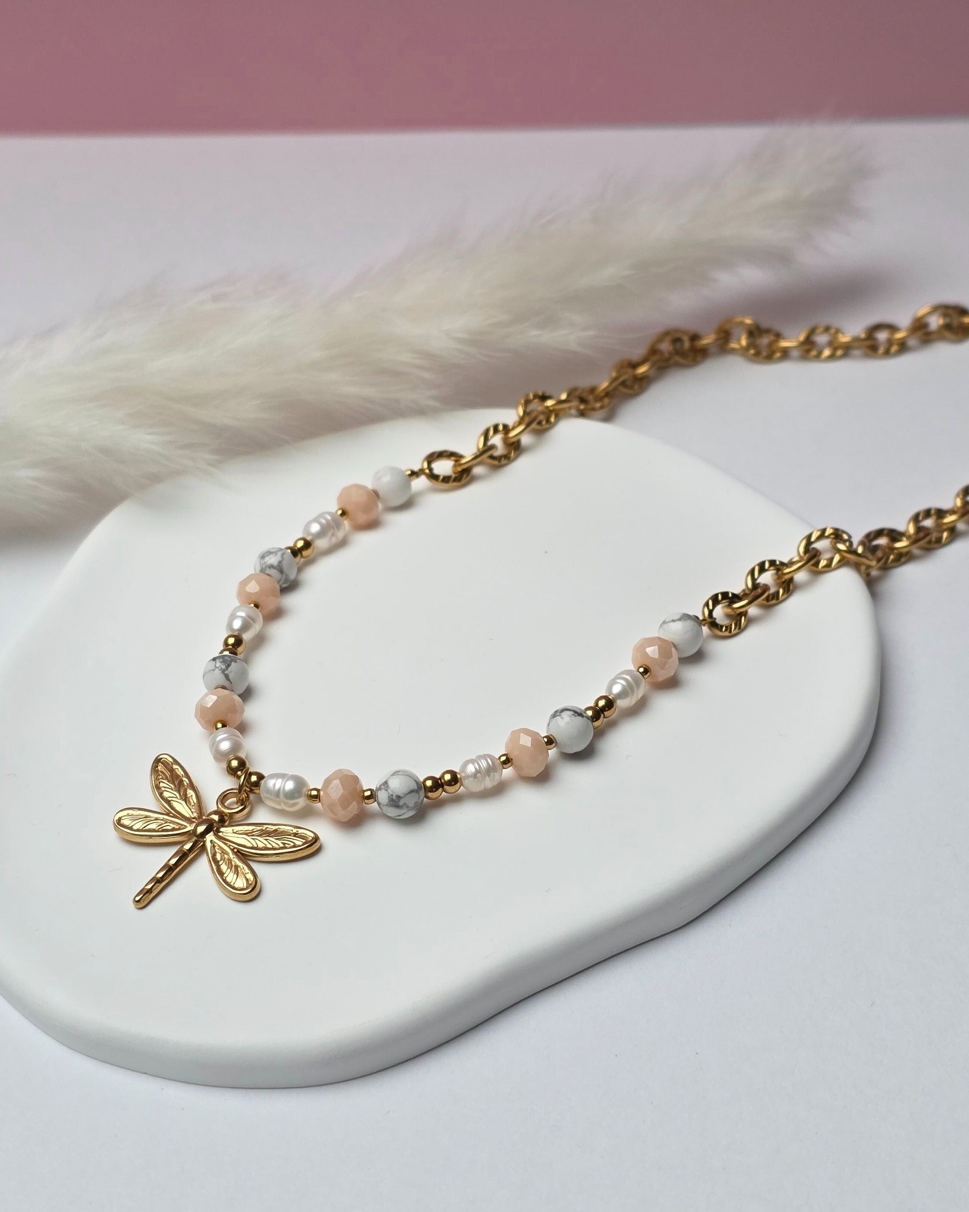 Vorne wird das Design durch einen eleganten Libellenanhänger ergänzt, der dem Piece eine feminine Leichtigkeit und einen modernen Ausdruck verleiht.