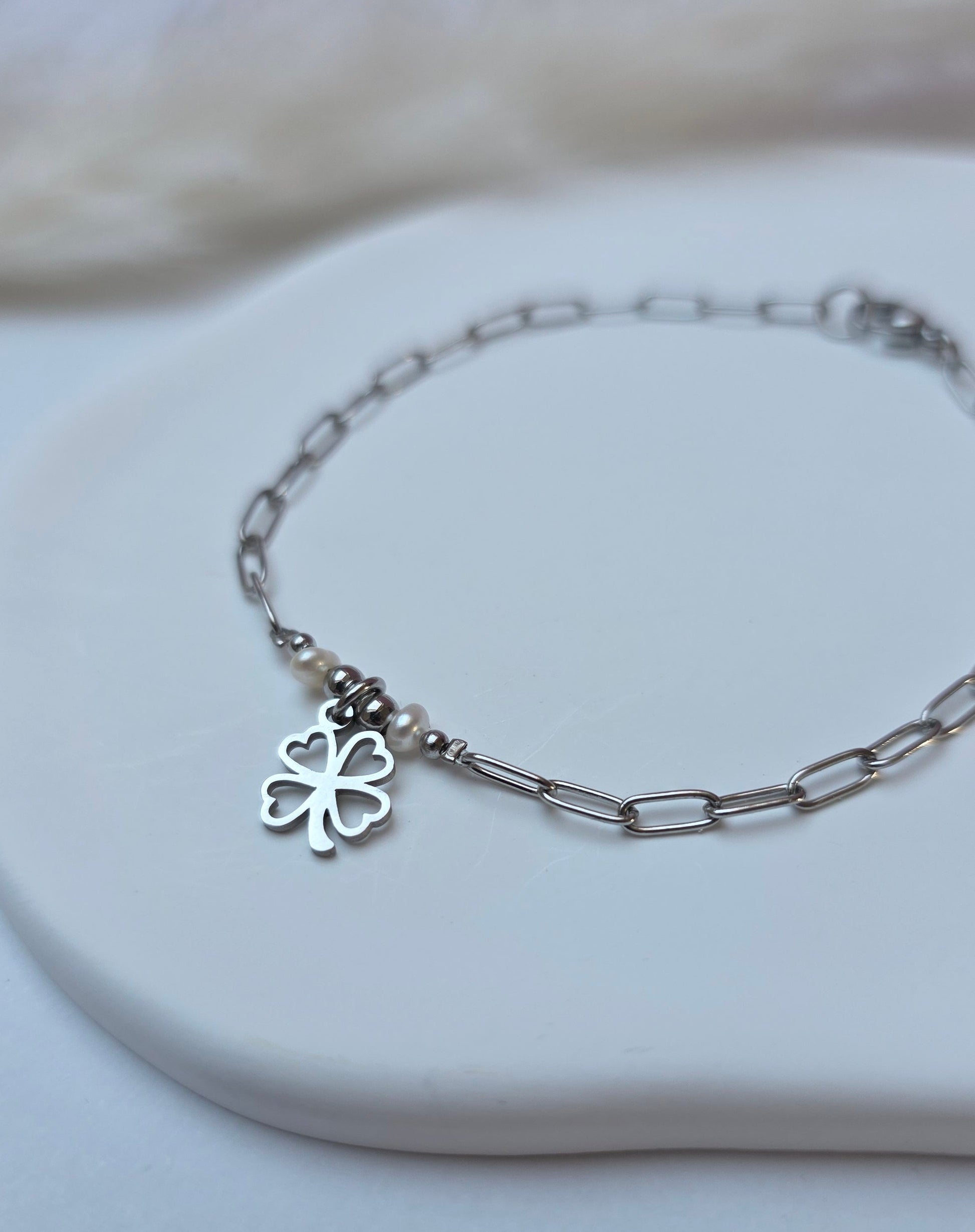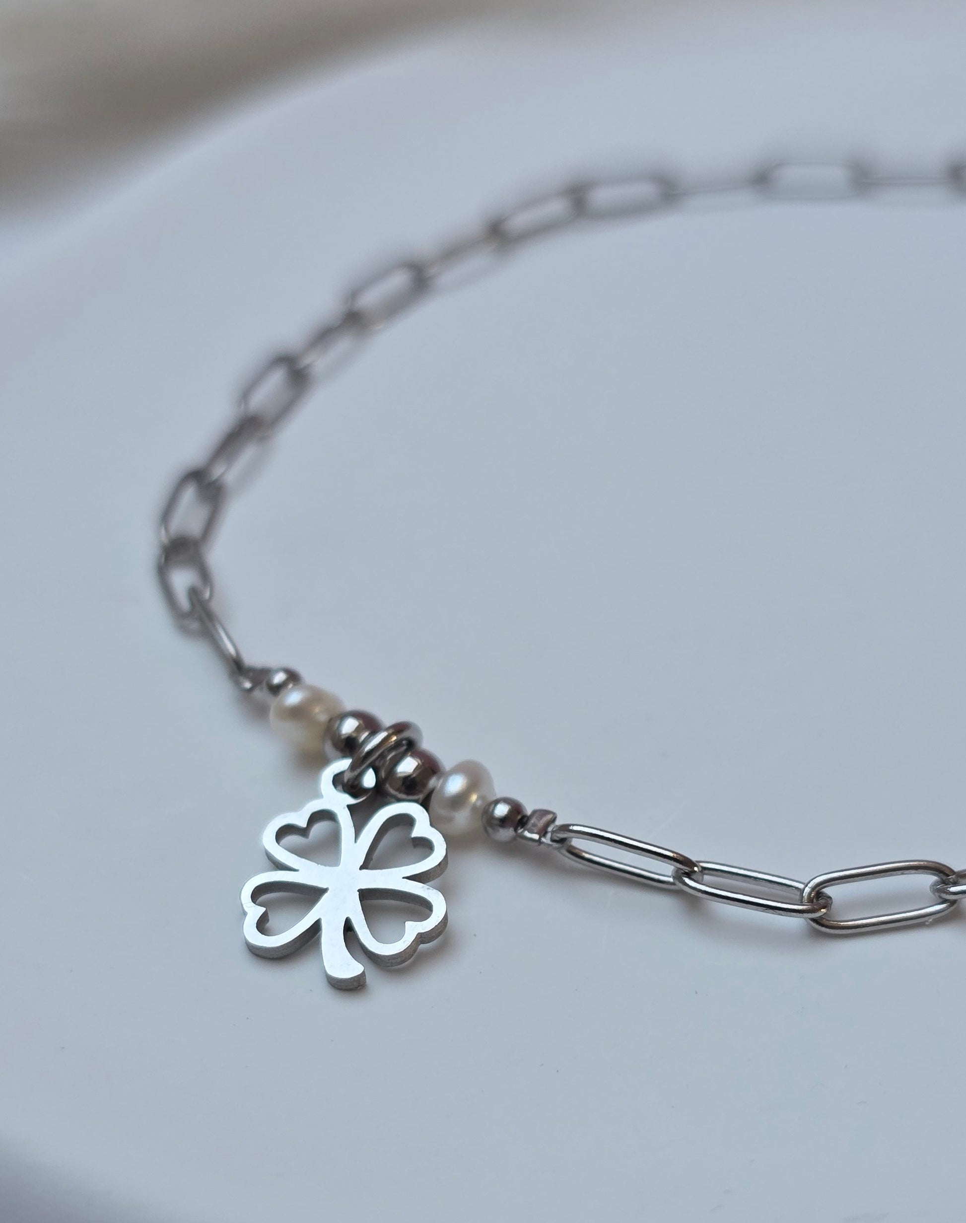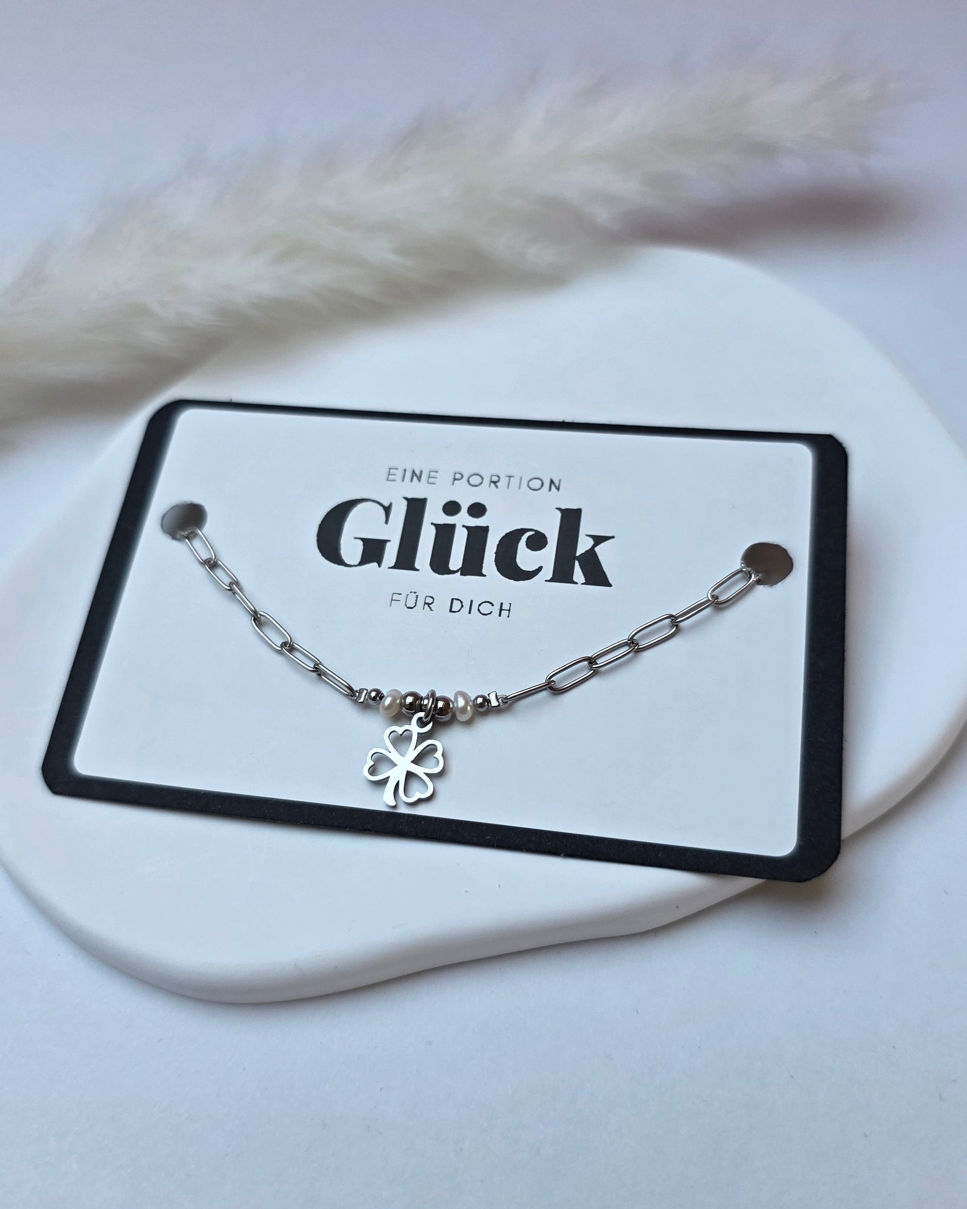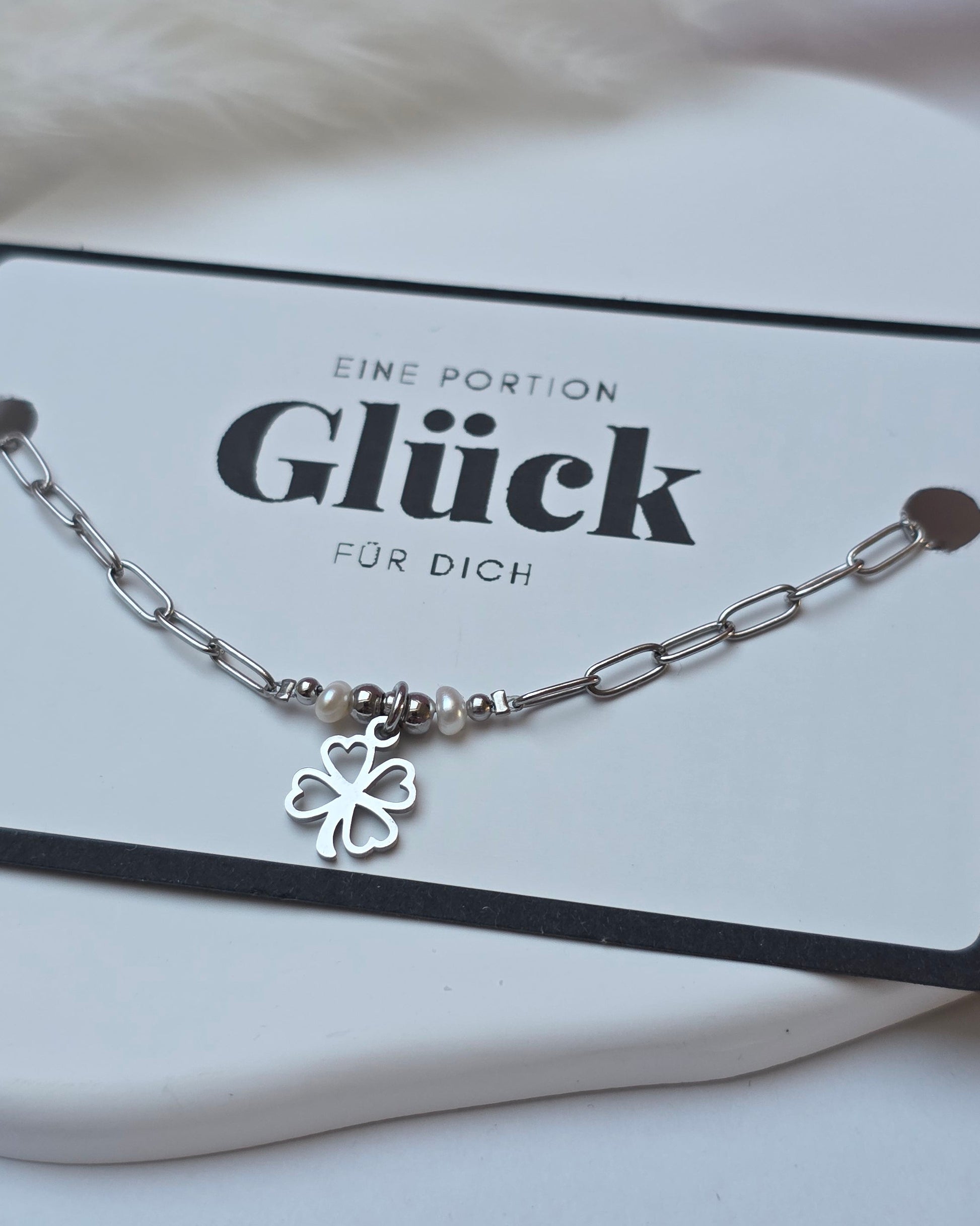 Portion Glück 2.0 ist ein zartes Armband aus einer feinen Edelstahlgliederkette, ergänzt durch klassische Perlendetails und ein kleines Kleeblatt als Glücksbringer.