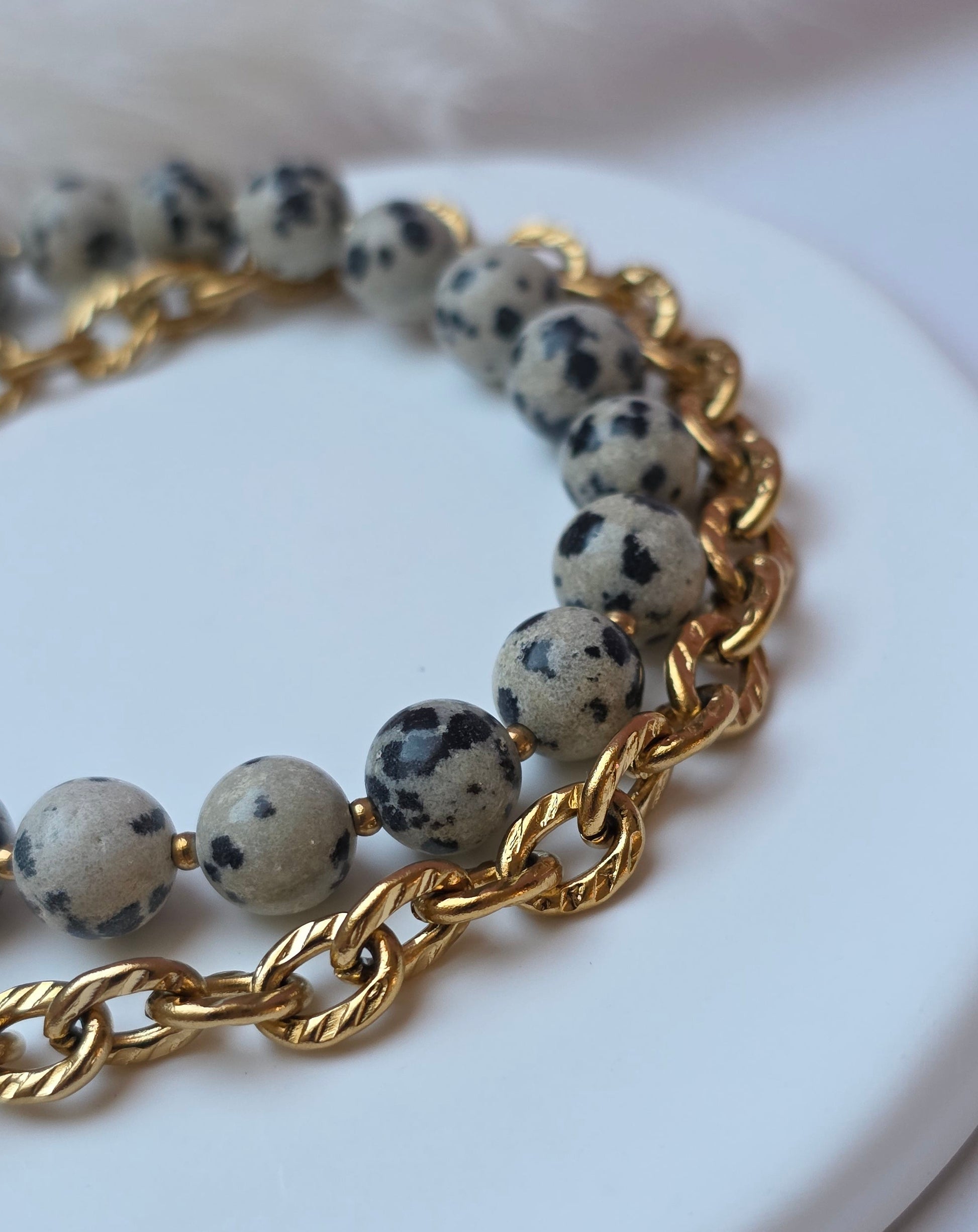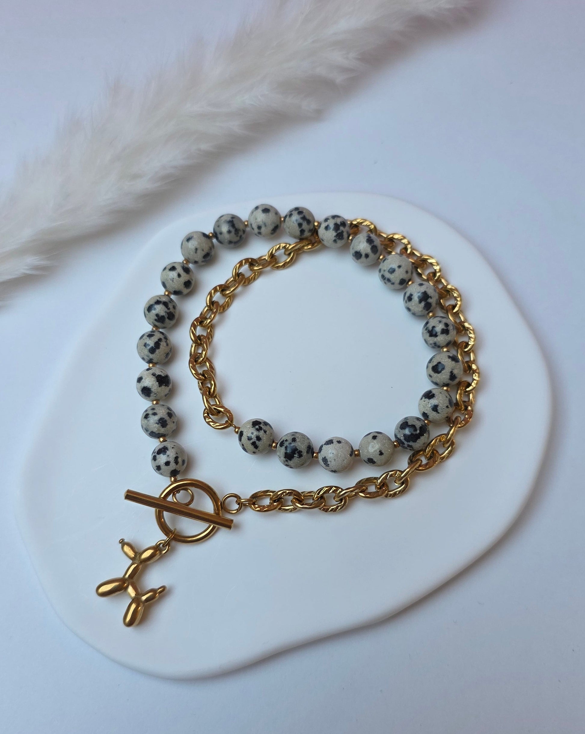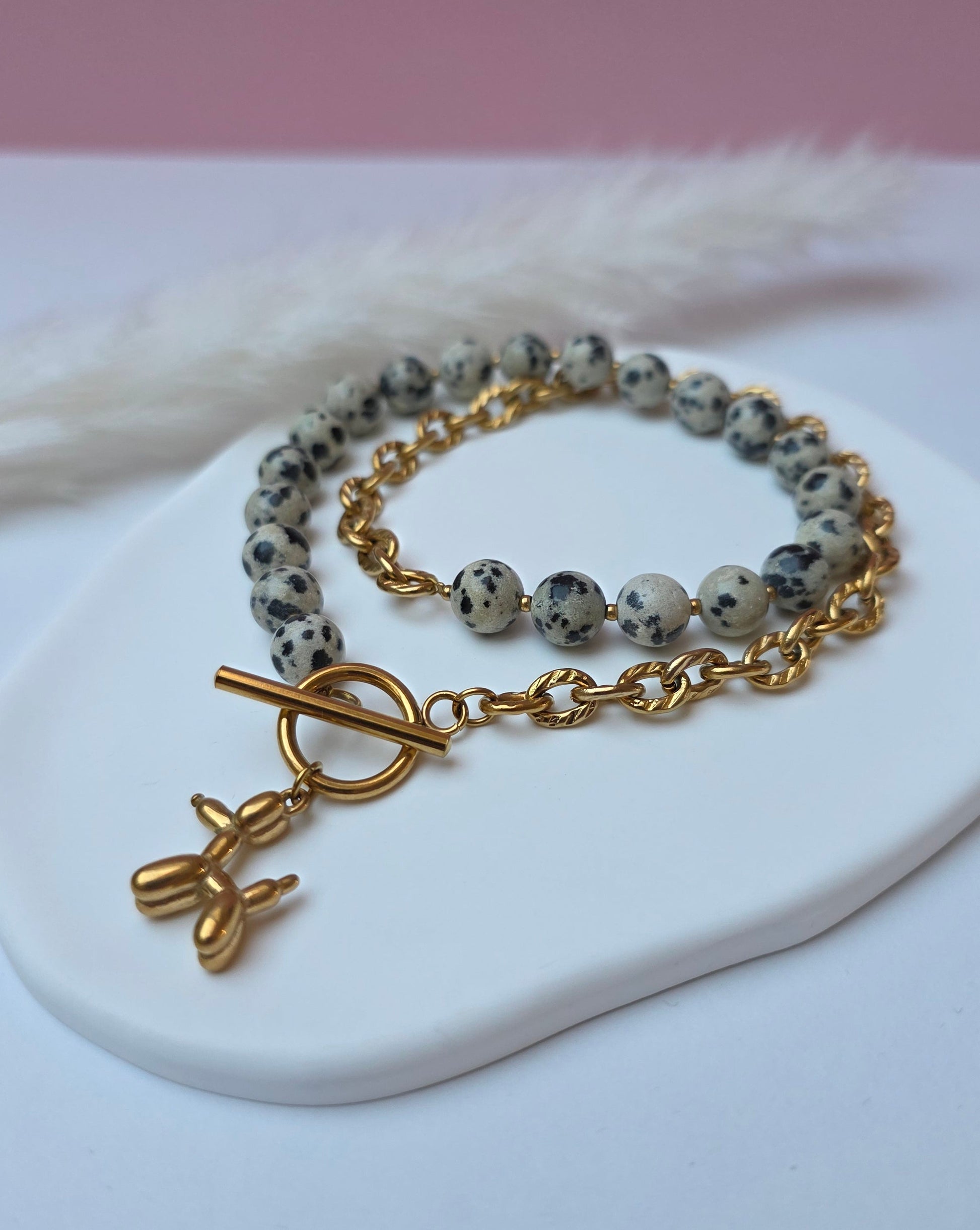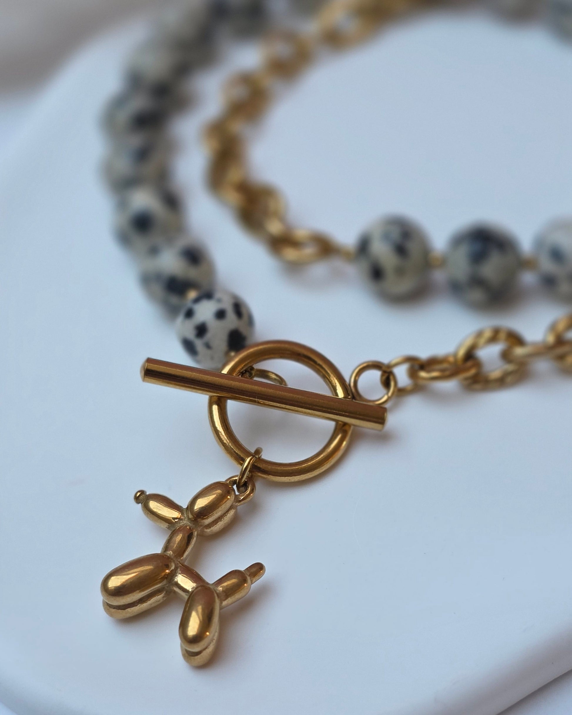 Die Kette Who let the dog out kombiniert Dalmatiner-Jaspis-Perlen mit einer markanten Edelstahlkette und bekommt dadurch ihren klaren Statement-Look. Vorne trifft alles in einem Knebelverschluss zusammen, ergänzt durch einen Ballonhundanhänger als stylisches Highlight. Ein Statement Piece mit klarer Attitude und echtem Hingucker-Faktor.